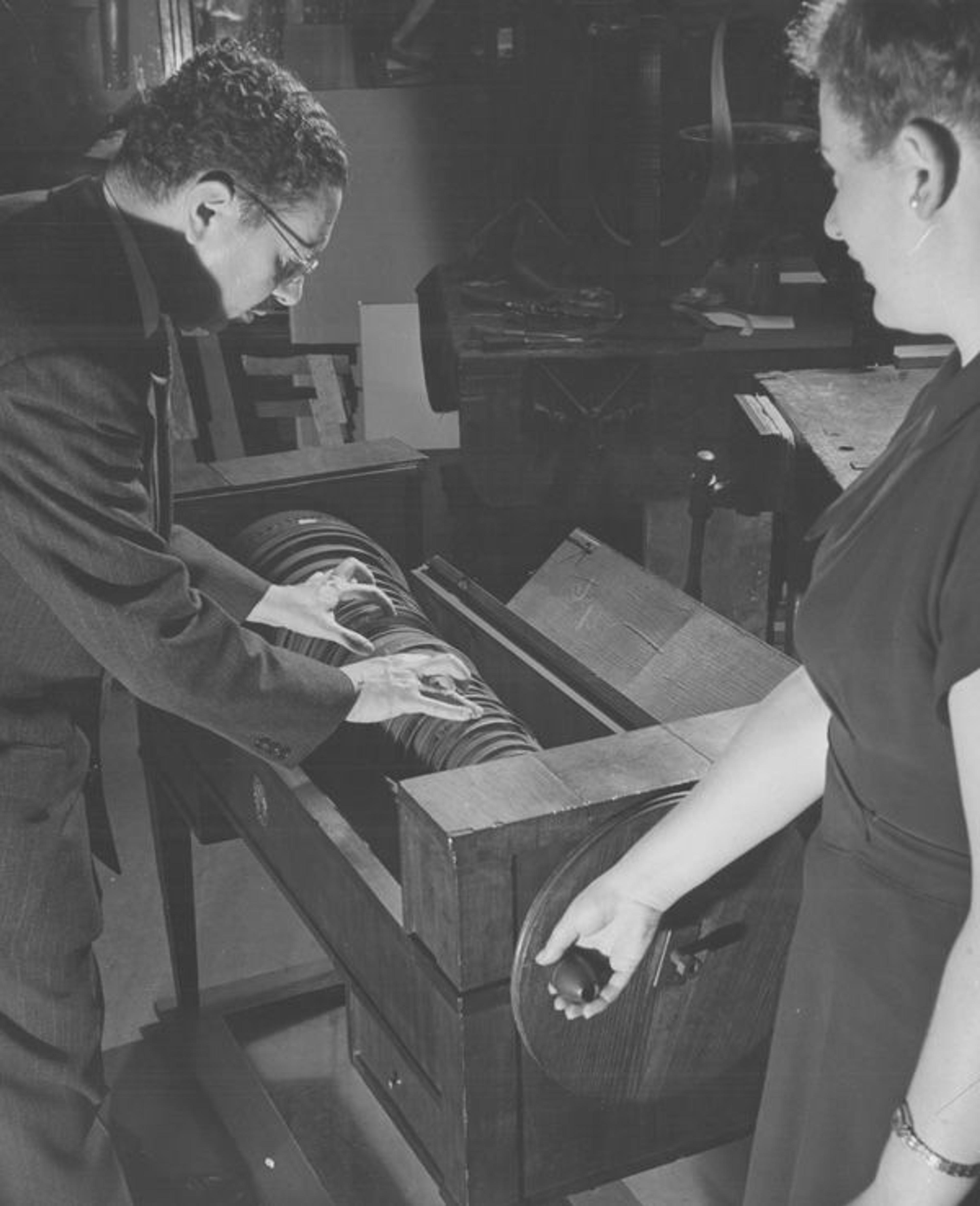 Left: Winternitz in the long-closed instrument galleries in the early 1940s, playing a glass harmonica. Departmental Assistant Sofula Novikova is seen turning the cylinder.