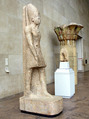 This capital was set atop one of the ten columns of a kiosk built in front of the temple of Amun at Hibis in Kharga Oasis. It is an early example of a composite capital, which included several kinds of plants combined into a design that, with time, became increasingly more elaborate and fanciful. Here, the composition is still rather simple, consisting of two cyperus species: eight plants of the common papyrus (Cyperus papyrus, above) alternating with eight foxtail flatsedge plants (Cyperus alopecuroides, below). The capital still shows remnants of its original paint.