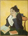Vincent van Gogh. Letter to his brother Theo. [early November 1888] [published in "The Complete Letters of Vincent van Gogh," 3 vols., Greenwich, Conn., 1958, vol. 3, p. 100, letter no. 559], writes that he has "an Arlésienne at last, a figure (size 30 canvas) slashed on in an hour, background pale citron, the face gray, the clothes black, black, black, with perfectly raw Prussian blue. She is leaning on a green table and seated in an armchair of orange wood," either this picture or F489 (Musée d'Orsay, Paris).