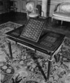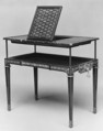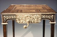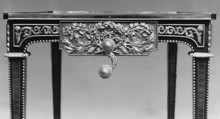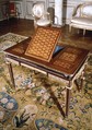 The number 2964 painted underneat the top of this table corresponds to an entry in the Journal du Garde-Meuble de la Couronne (a ledger listing new furniture for the royal residences) and identifies this multipurpose table as one of the first pieces ordered by Marie-Antoinette from her favorite cabinetmaker, Jean-Henri Riesener. A native of Westphalia, Riesener had a successful career in Paris and made many sumptuous pieces for the queen. This table was delivered to Versailles on December 12, 1778, exactly a week before the long-awaited birth of her first child, Marie-Thérèse-Charlotte. To alleviate Marie-Antoinette’s discomfort during the advanced state of her pregnancy, this table was fitted by Mercklein, a mécanicien in her service, with a special mechanism. Hidden behind a finely decorated gilt-bronze plaque at either end, this mechanism allowed the queen to use the table in either a seated or a standing position. By means of a detachable crank at one side, the top can be raised or lowered on ratcheted metal shafts that move up or down in the hollow legs. The table could be used for various activities such as eating and writing and also reading and dressing, since the central panel of the top can be lifted to form a lectern and reversed to reveal a mirror. Pressing buttons along the front edge of the table releases the hinged lids to six compartments for the storage of cosmetic and writing equipment. The intricate marquetry decoration of the top has lost some of its subtle coloring over time. Framed alternately with natural (originally white) holly and black-stained holly, the bois satiné trelliswork encloses rosettes cut of an originally bright yellow barberry wood against a stained, soft yellow sycamore ground.