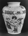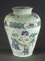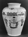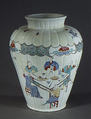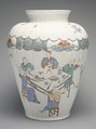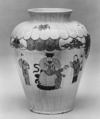 The imitation of Japanese porcelain was a priority at Chantilly, where the prince de Condé established a porcelain factory in 1730. His collection of Asian ceramics may have served as direct models for pieces made at Chantilly. This jar copies a Japanese form. The painted scenes are derived from print by Jean-Antoine Fraisse (ca. 1680–1739), whose Book of Chinese Designs (1735) was a source of motifs for the factory’s painters.
