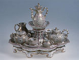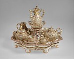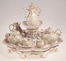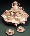 Tray (.1): H. 8 3/8 in. (21.3 cm.); Gr. Diam. 19 5/8 in. (49.8 cm.); coffeepot with cover (.2ab): H. 7 1/2 in. (19.1 cm.); teapot with cover (.3ab): H. 4 15/16 in. (12.5 cm.); sugar bowl with cover (.4ab): H. 4 9/16 in. (11.6 cm.); bowl and dish (.5ab): H. 2 1/8 in. (5.4 cm.); milk jug (.6): H. 4 3/4 in. (12.1 cm.); cream pitcher (.7): H. 2 3/16 in. (5.6 cm.); cups (.8,.10): H. 1 5/8 in. (4.1 cm.), Diam. 2 13/16 in. (7.1 cm.); saucers (.9): Diam. 4 3/4 in. (12.1 cm.); saucer (.11): Diam. 4 13/16 in. (12.2 cm.)