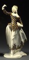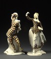 Bustelli modeled sixteen characters from the Italian commedia dell'arte, the lively improvisatory theater that came to life in the sixteenth century. Harlequin was the commedia's principal character, always dressed in a brightly colored suit of triangular patches. Sometimes he was accompanied by Columbine, who played different roles in the plays. Here Harlequina wears the same patchwork costume as her partner. Although some of Bustelli's figures were inspired by engravings, they all have a sense of graceful movement that suggests the artist's firsthand impression of a theatrical performance.
