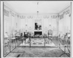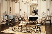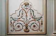 The design of this Neoclassical paneling incorporates fluted pilasters crowned with Corinthian capitals and three sets of double doors that alternate with carved panels. The latter are embellished below with symmetrical arabesques and vases in low relief and with graceful swags at the top, but they all differ slightly from each other. No eighteenth-century provenance has been discovered for this woodwork, but by 1874 it had been installed in the first-floor (American second floor) gallery of the Hôtel de Lauzun, a seventeenth-century residence on the Île Saint-Louis in Paris. The house was then occupied by the baron Jérôme-Frédéric Pichon (1812–1896 ), a well-known collector and bibliophile. Stripped to its bare oak and stained a dark shade of brown, the paneling lined the walls of his library. With its four large windows overlooking the quay and the river Seine, this room was the setting for eccentric parties at which Pichon entertained literary contemporaries such as Charles Baudelaire and Théophile Gautier. The paneling remained in place until the baron’s grandson, Louis Pichon, acquired the hôtel in 1905. Having a stricter aesthetic sense and a desire to restore the seventeenthcentury appearance of the gallery, he dismantled and sold the boiserie. It arrived at the Museum in 1976. When microscopic analysis revealed little about the original paint below the stain, the woodwork was repainted in a monochrome gray-green distemper to harmonize with the three grisaille overdoors, which have been associated with the paneling but did not originally belong to it (see detail above). Showing children representing spring, summer, and winter, they are duplicates of the overdoors representing the four seasons painted about 1787 by Piat Joseph Sauvage (1744–1818 ) for Queen Marie-Antoinette’s dairy at Rambouillet.