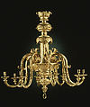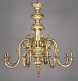 One of a pair supplied to James, third Viscount Scudamore (d. 1716) for the State Apartments at Holme Lacy, Herefordshire, this chandelier is in the "French arabesque" manner of William III's architect Daniel Marot (ca. 1663–1752). The court cabinetmakers Moore and Gumley specialized in finely carved gilt-gesso furniture. Holme Lacy later descended to the Earl of Chesterfield. In 1910 he moved much of the contents, including this chandelier, to Beningbrough Hall, Yorkshire, where it remained until 1958.