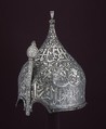 This especially attractive and well preserved turban helmet retains the mail aventail that protected the lower half of the face and neck. The aventail is fixed with a lead seal stamped with the mark used in the Ottoman arsenals, an indication that this example, like the other turban helmets exhibited in this virtrine, passed into Turkish possession as booty with the Ottoman conquest of Iran and the Caucasus.At least one turban helmet decorated in a style comparable to this example bears the name of Farruhk-Siar (r. 1464–1501), ruler of Shirvan in the Caucasus. Such evidence suggests that this helmet, too, is of Shirvan manufacture.