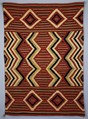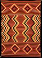 A long tradition joins Native American and European aspects of textile design and technique in the southwestern United States. The cultivation and weaving of cotton were practiced among the peoples of the region from about the tenth century, but the importation of wool-bearing sheep during the centuries of Spanish domination profoundly shaped the production and use of textiles. Mexico, with its own Spanish-based traditions, was also influential as both a source and a market. In spite of the turbulent events of the nineteenth century, in which the region became part of the United States, many Native American textiles were produced. The Navajos in particular became significant weavers. During the second half of the century a major body of work was made; after 1865 much of it was intended for sale. Serapes, or wearing blankets are prominent in Navajo work of this period. They are strongly colored and vibrantly patterned. Many, as in the present example, elaborated on long-established design themes. Differing weaving traditions are reflected in the horizontals, diamond shapes, and serrated edges, which are characteristically Navajo, and the vertical zigzags, which are based on Saltillo patterning. A town in northwestern Mexico, Saltillo has given its name to a large number of locally made textiles of European-derived design.