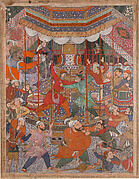 This painting by Tara, the most important painter in the atelier of Maharana Sarup Singh, shows the ruler of Mewar viewing a prize stallion with a large entourage of courtiers. The richly decorated textile elements — such as the summer carpet and the canopy — transform this temporary outdoor installation into an almost palatial setting. Tara was an accomplished recorder of major events in the maharana’s life at Udaipur palace and in the countryside of his realm. An inscription on the reverse identifies the ruler, the horse, and principal courtiers, suggesting that this painting documents a specific event, perhaps the maharana’s birthday.