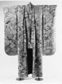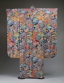 (Back view) The resist-dye art of "shibori" is exquisitely represented by this "furisode" (swinging sleeves) kimono for a young woman. A technique dated to at least the Silk Road era, "shibori" utilizes folding, stitching, binding, sheathing, and knotting to protect areas of fabric from penetration during dyeing. A dyer must plot his design exactly on the fabric yardage because kimono size and shape are standardized and the textiles have a fixed loom width, rarely being cut during garment construction. The uninterrupted back area is traditionally the focus for display, and Itoh's virtuoso craftsmanship achieves a continous pattern that impressively crosses the center-back seam and makes the jump between body and sleeve. Additionally, this magnificent design exhibits extreme intricacy of composition, resist knotting (each hand tied eleven times), and pigmentation. Itoh's revival of the virtually lost technique of including as many as 3,600 knots per square "shaku" (approximately one square foot) results in exceptional detail and vibrancy, demanding as much as two years of labor for each masterpiece.