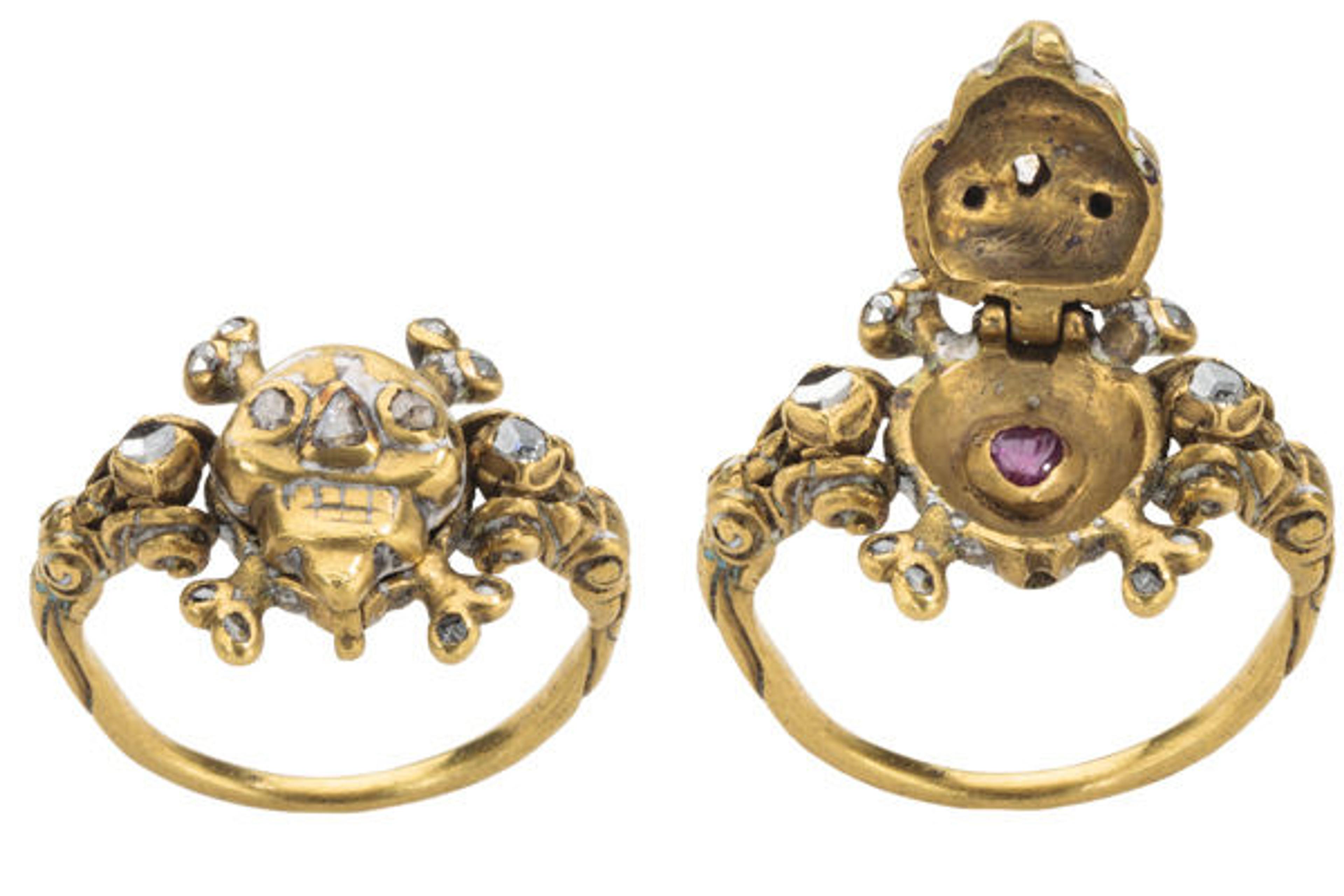 Views of the Renaissance gimmel ring with memento mori together and apart