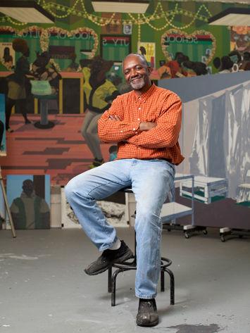 Left: Kerry James Marshall in his studio. Photo by Kendall Karmanian