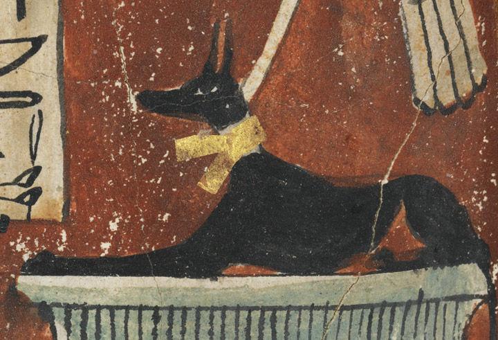 A detail of one of Nesmin's cartonnage elements depicting the god of mummification, Anubis. Mummy of Nesmin with plant wreath, mummy mask, and other cartonnage elements (detail). Ptolemaic Period (200–30 B.C.). From Egypt, Akhmim, Egyptian Antiquities Service/Maspero excavations 1885–86. Painted and gilded cartonnage. The Metropolitan Museum of Art, New York, Funds from various donors, 1886 (86.1.51)