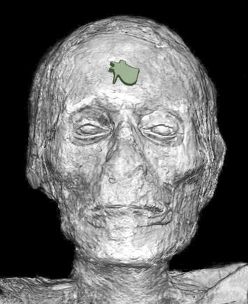 Left: A 2016 volumetric rendering of Nesmin's head (the wedjat eye amulet on his forehead is artificially colored in green)