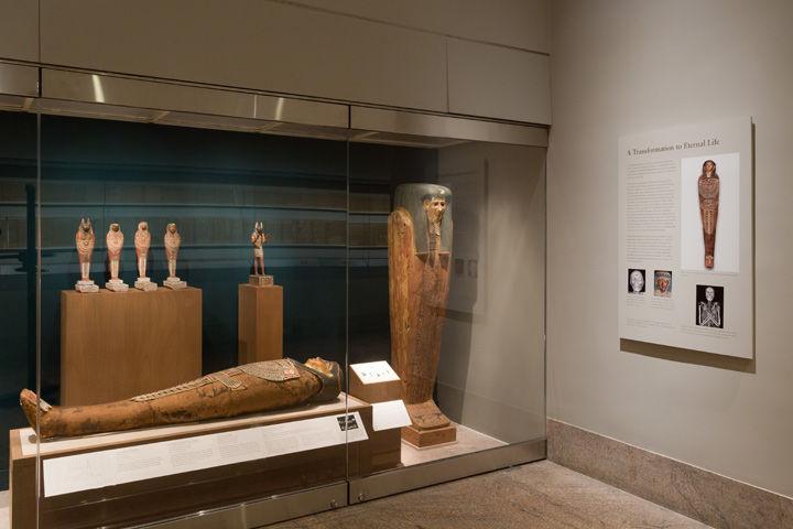 The mummy was CT scanned in 2011 with the help of the NYU Langone Medical Center's Department of Radiology. The resulting data allowed us to see these 31 amulets very clearly, and an image of them is now included in an updated label text in the new galleries. In addition, a new display of several similar amulets is presented right next to Nesmin's mummy.