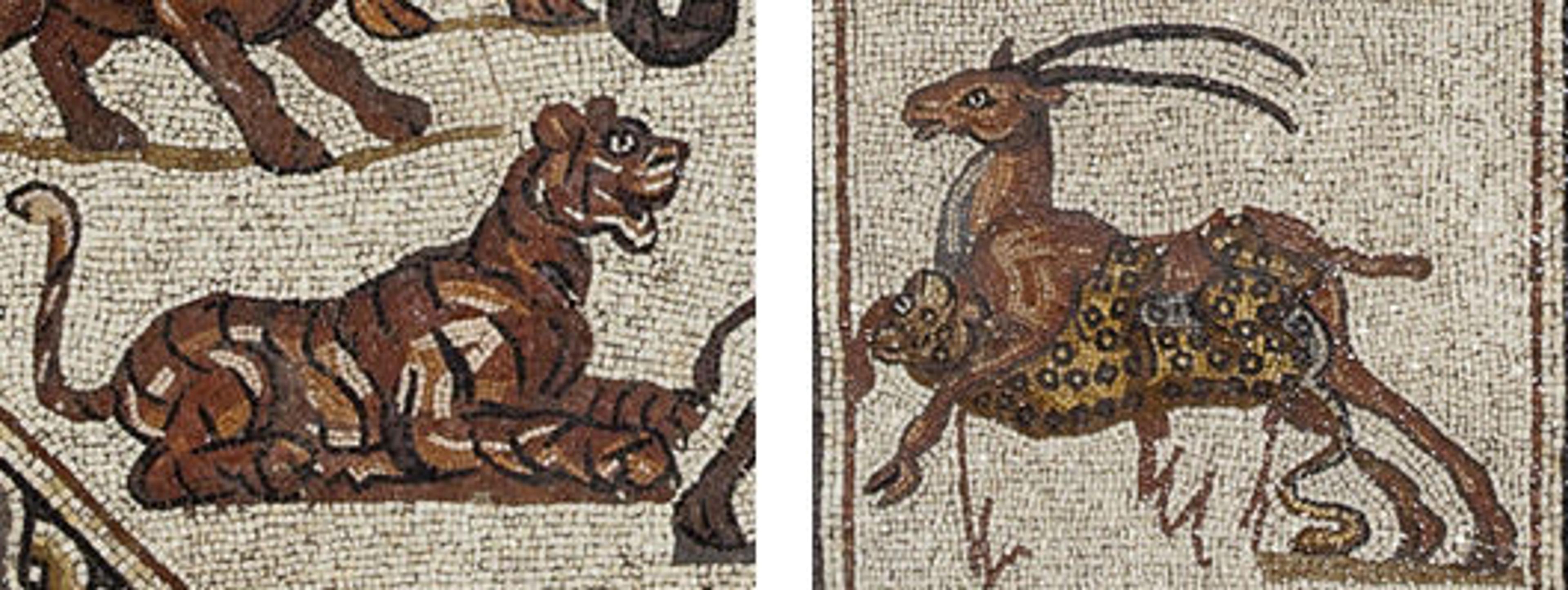 Apart from the mythical ketos, the other creatures shown on the Lod Mosaic are not so bizarre. As well as lions, three other large cats are depicted—there is a tiger in the central medallion and a leopard appears in the square to its right, attempting to pull down a long-horned gazelle. Two more tigers and leopards are seen attacking other animals in the rectangular panel at the northern end of the floor. These are in keeping with the naturalistic depictions of the various birds, fish, and other animals that are found on the Lod Mosaic, but in the square on the main axis of the central panel we find two female panthers holding on to the sides of a large metal krater (mixing bowl). (See Collections for an image of a Roman statuette of a panther.)