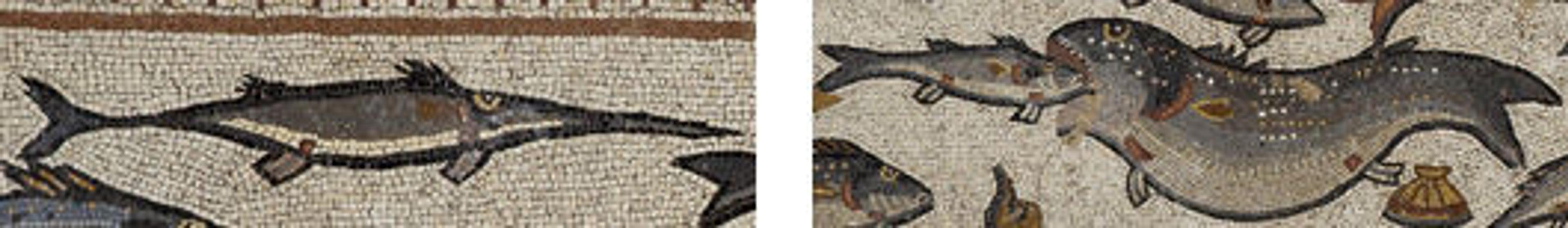The ships in the marine scene on the southern end panel have already attracted much scholarly interest. Little, however, has been said about the creatures that populate the sea around the ships. Although the representations are stylized, the fish and marine creatures would have been much more familiar to people who lived around the shores of the Mediterranean than some of the more exotic land animals that are depicted on the Lod Mosaic. As well as the easily recognizable dolphin in the center of the panel, several different types of fish are represented, many of which presumably formed part of the regular diet at least of those who lived close enough to the sea to get fresh fish. (See Collections for an image of a Roman flask shaped like a fish.) The mosaic also depicts several marine mollusks that may be identified as murex and bivalve shells, remains of which are frequently found on ancient sites.