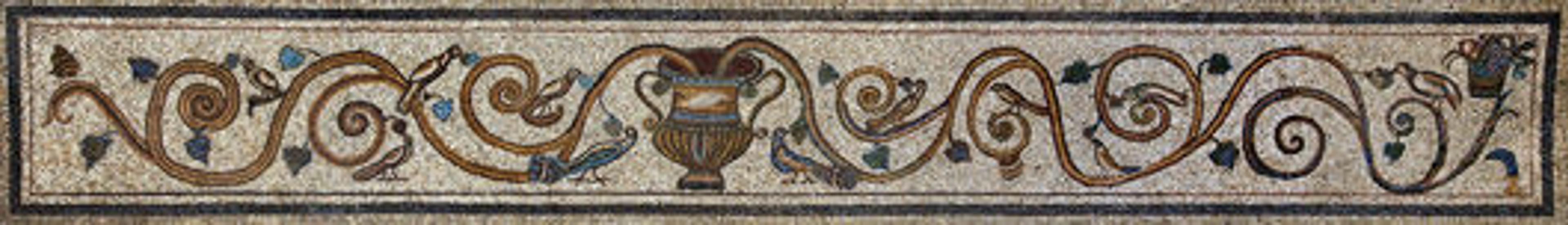 Between the two floors there is a long, narrow panel that is seen as marking a threshold. It contains at its center a large krater flanked by peacocks, while other birds either perch on or peck (or both) the fruit off the vine tendrils that issue from the vase. Here again many of the details are highlighted by the use of not only bright blue glass tesserae but also other vivid colors—green, deep red, and yellow—and the krater is further decorated with bands of gold glass tesserae. It is clear from the arrangement of the plain, white stone tesserae surrounding this panel that it was a later addition to the floor, probably executed by a third craftsman, although it cannot be ascertained when the changes were made.