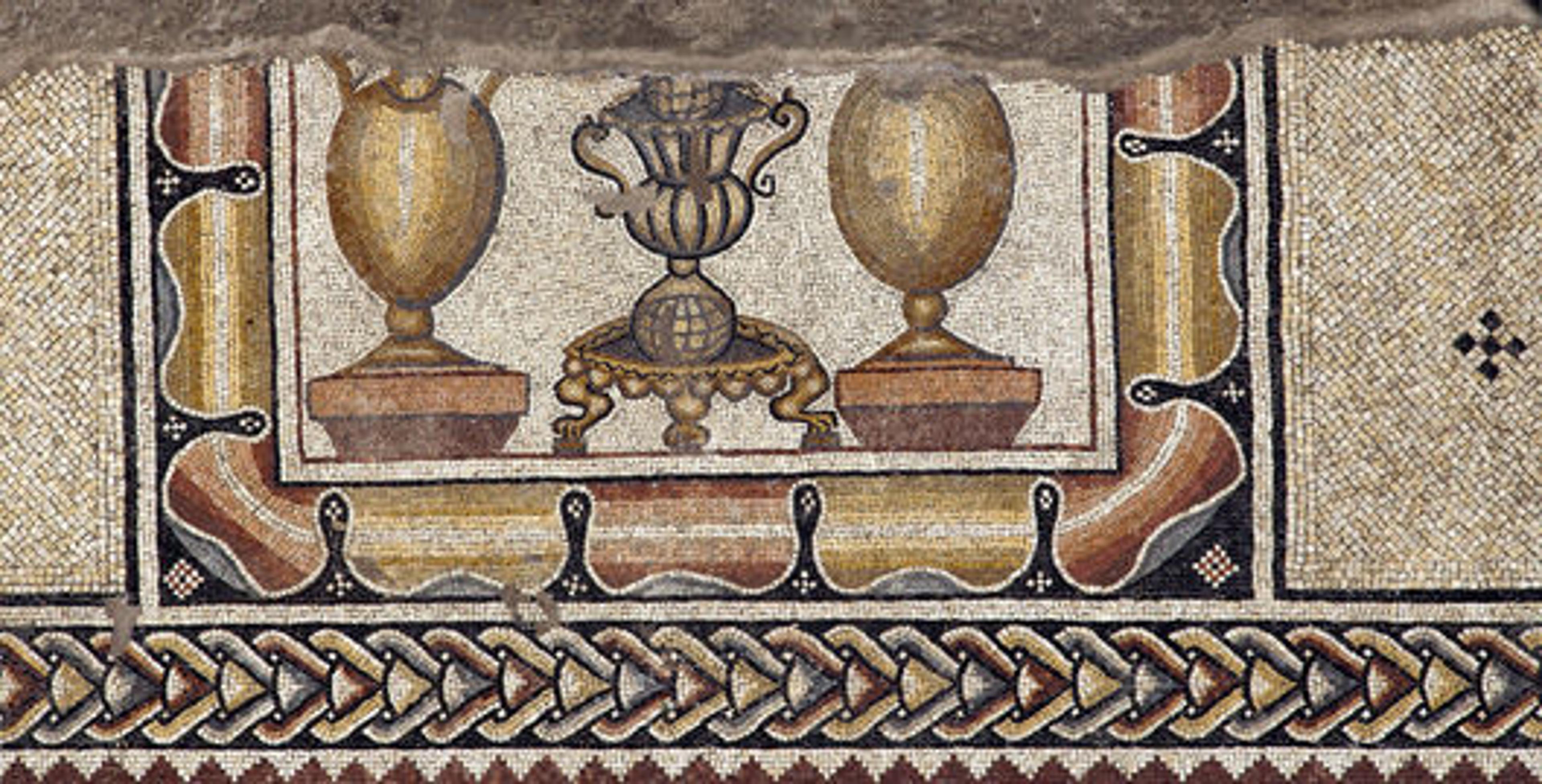 As already noted, the panther was particularly associated with the god Dionysus (see Triumph of Dionysos and the Seasons Sarcophagus), and so the scene here, as well as recalling actual examples of such vases with zoomorphic handles, may have been deliberately chosen to symbolize prosperity and well-being. The idea of wealth and generous abundance is repeated in the depiction of other large, golden vases on other sections of the mosaic.
