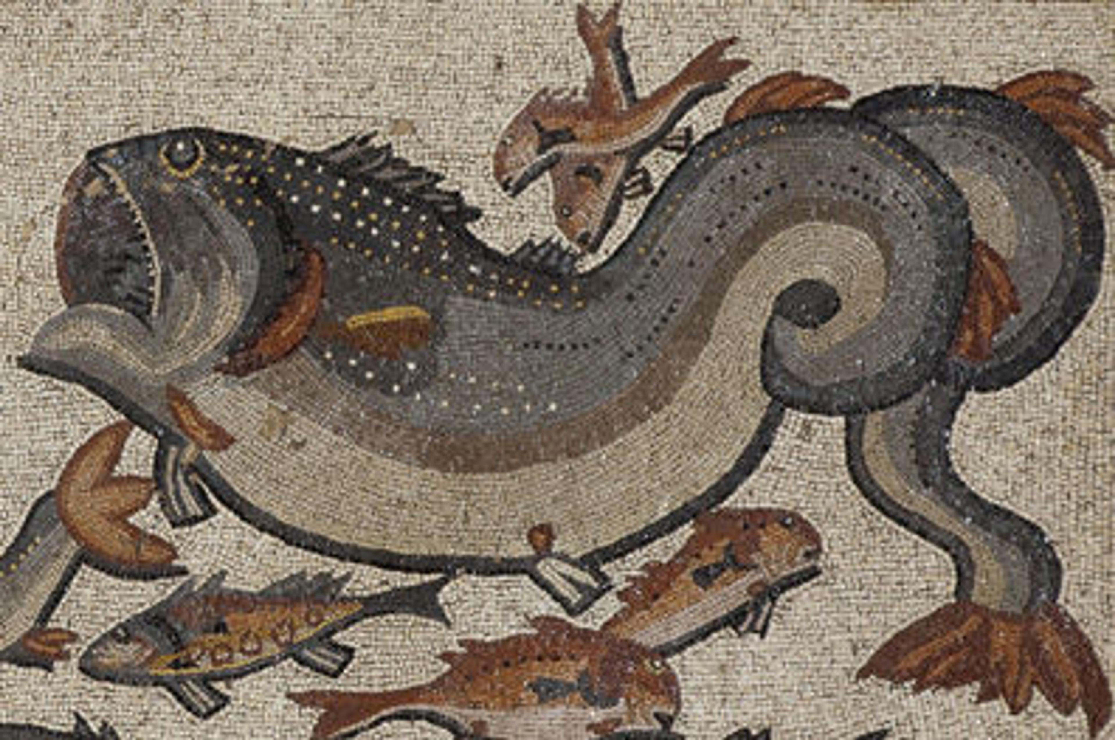 Dominating the right upper part of the mosaic is a very large fish with a long, spiral tail. In all likelihood it represents a whale, which is about to swallow the damaged merchant ship in the center of the panel. The whale has the same curly tail as the ketos on the octagonal medallion on the main panel. The two creatures were often confused and conflated in ancient literature and artistic representations.
