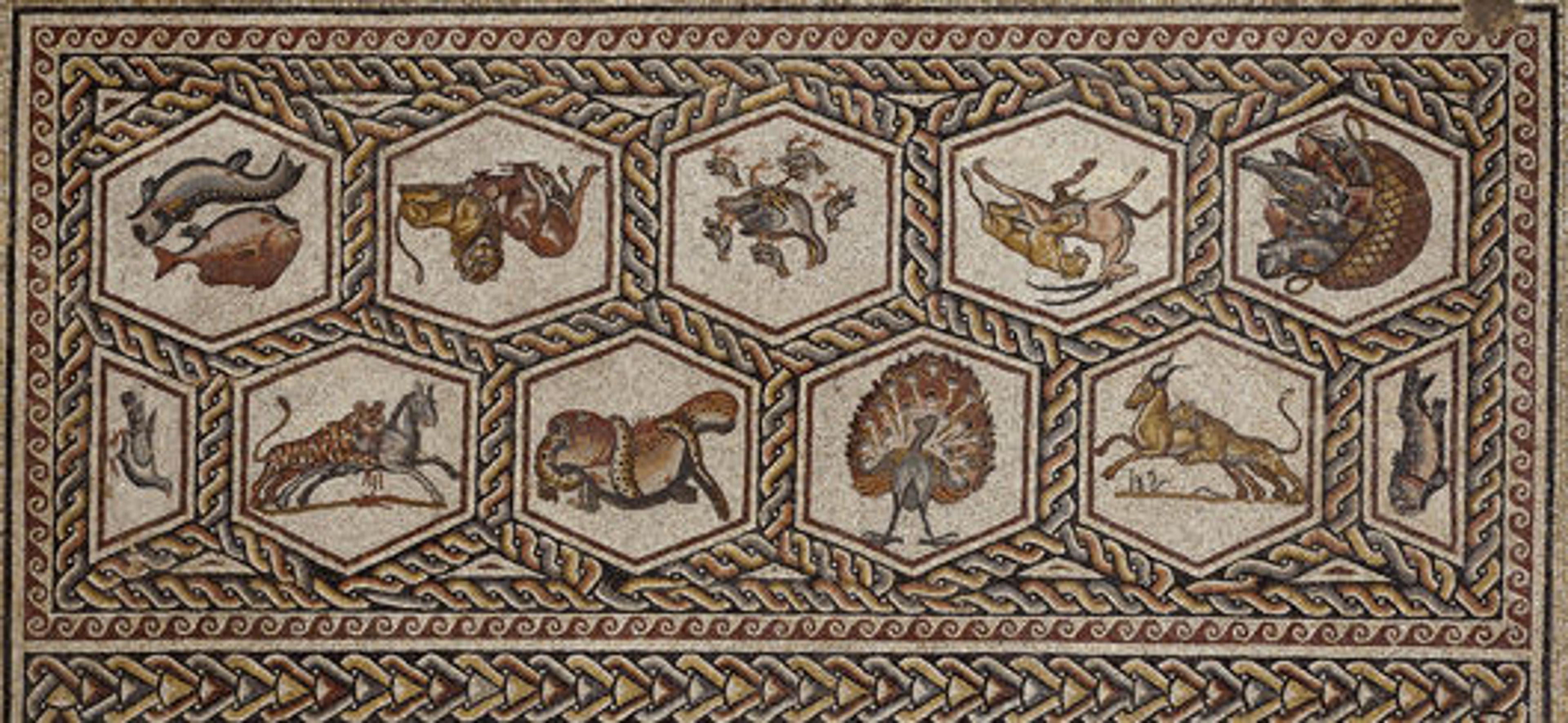 The depiction on the Lod Mosaic of solitary or paired groups of creatures, such as a large feline hunting a grazing animal, forms part of the common stock of genre subjects. Nevertheless, the composition reveals essential differences from other known mosaics, implying that the choice of subjects was deliberate and specific. For example, the central panel with the assortment of African and other animals defies immediate interpretation.