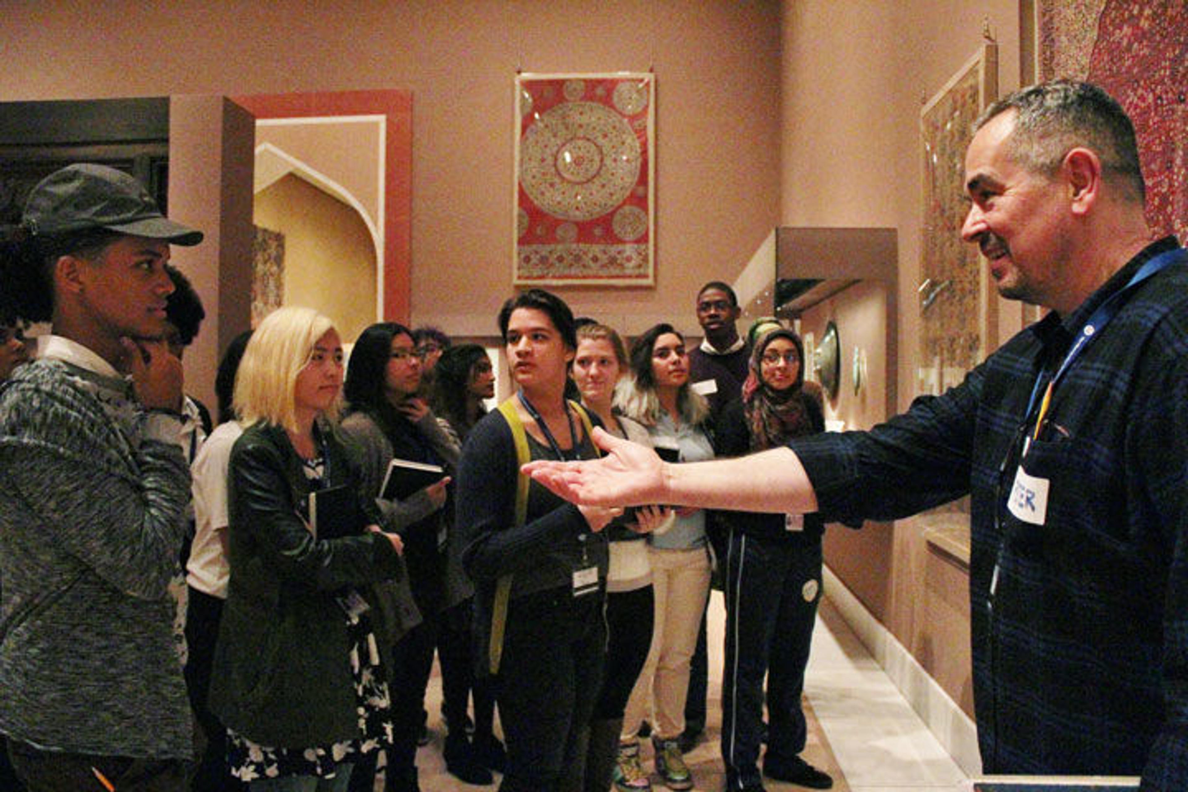 Maryam and her fellow high school interns discuss the traditions and symbols involved in rug making with Artist in Residence Peter Hristoff. Photo by Emily Chow Bluck