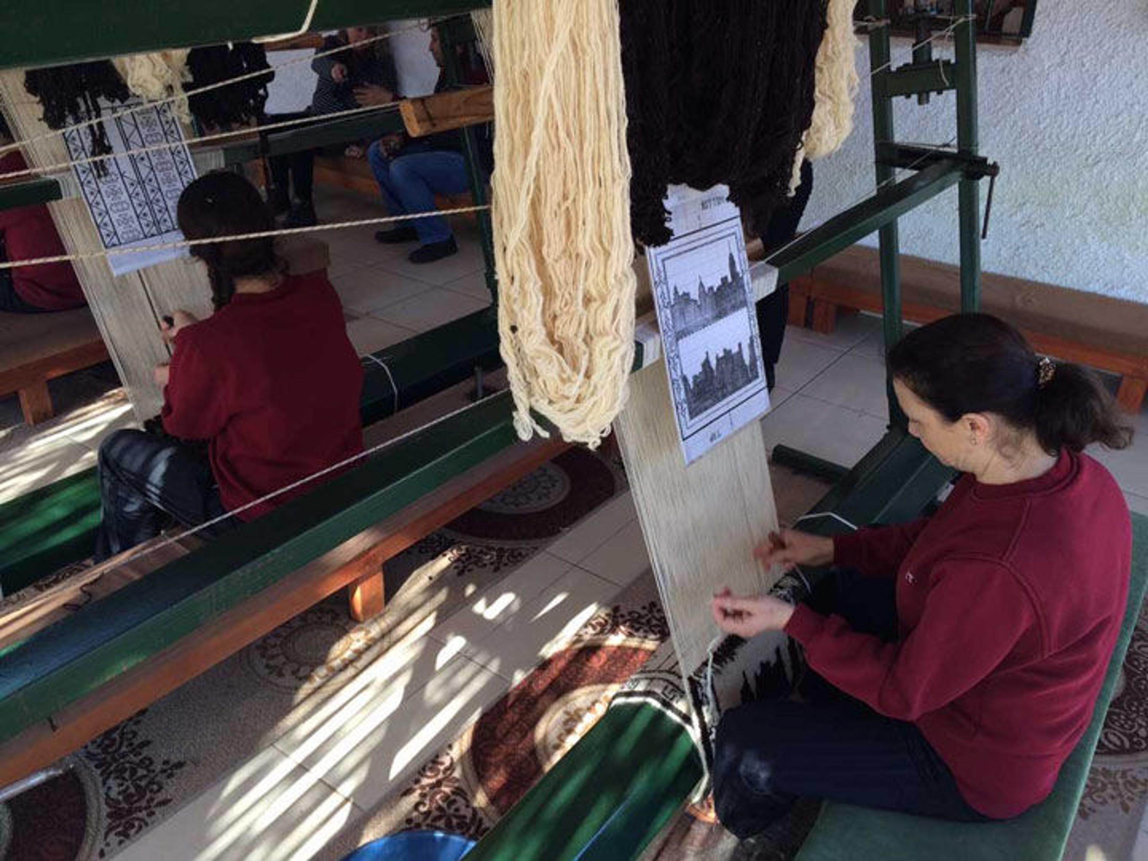 Weavers at the Can Carpet studio in Camlik, Turkey, work on rugs designed by high school interns. Photo by Peter Hristoff