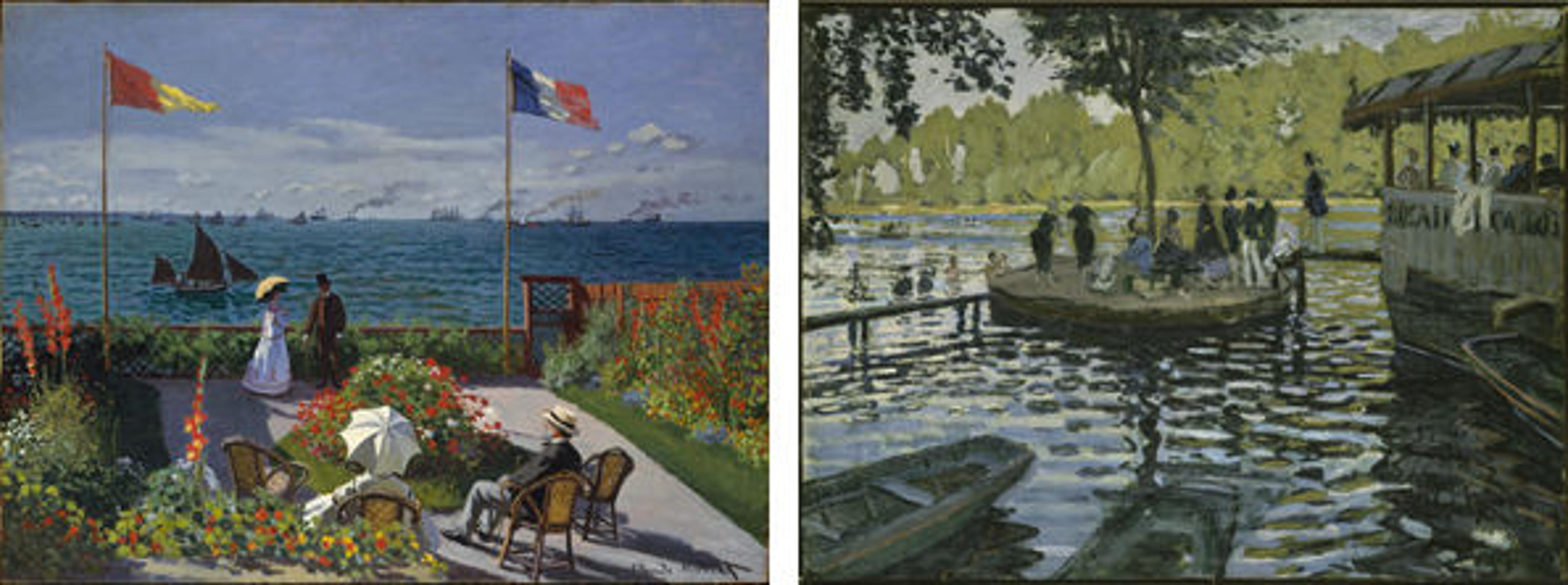 Left: Claude Monet (French, 1840–1926). Garden at Sainte-Adresse, 1867. Oil on canvas; 38 5/8 x 51 1/8 in. (98.1 x 129.9 cm). The Metropolitan Museum of Art, New York, Purchase, special contributions and funds given or bequeathed by friends of the Museum, 1967 (67.241). Right: Claude Monet (French, 1840–1926). La Grenouillère, 1869. Oil on canvas; 29 3/8 x 39 1/4 in. (74.6 x 99.7 cm). The Metropolitan Museum of Art, New York, H. O. Havemeyer Collection, Bequest of Mrs. H. O. Havemeyer, 1929 (29.100.112)