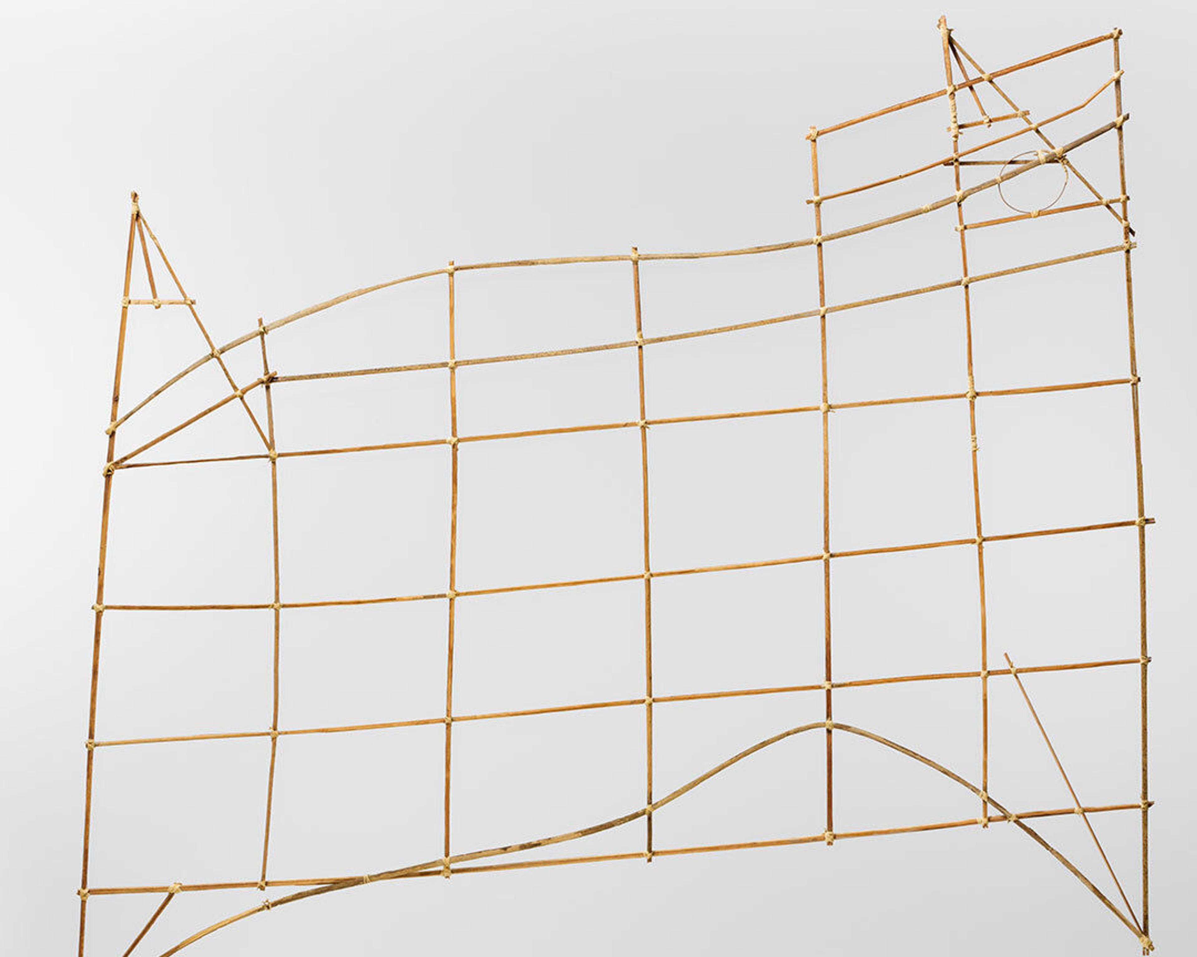 This example consists of a gridlike structure of seven vertical sticks lashed to four horizontal ones. The corners extend outside the main grid, while three curved strips, possibly representing the patterns of ocean swells, extend from side to side. The intersections created by the slanting sticks at the corners may indicate the locations of specific islands. In some instances, small cowrie shells, absent on this example, are also used to indicate the positions of individual islands.