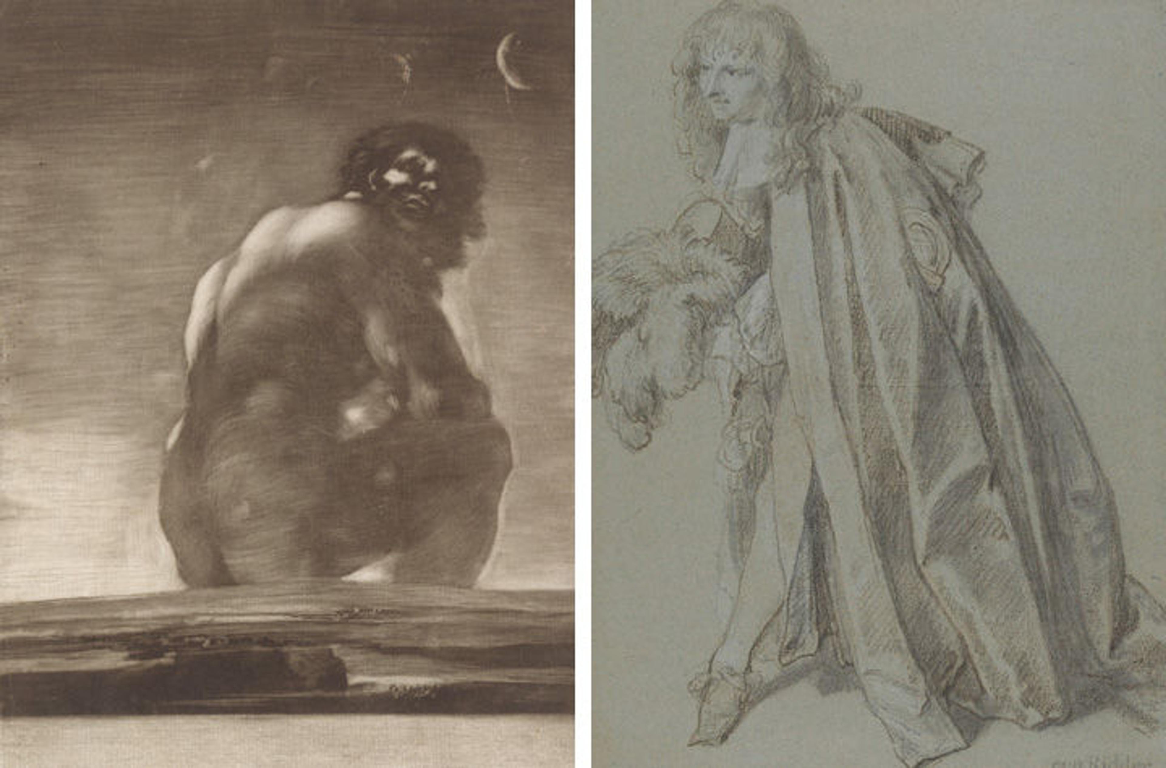 The tone block for this woodcut is sometimes printed in an orange-brown, casting a hellish glow onto the scene; here the use of a gray tone block creates an atmosphere of nocturnal gloom from which the three witches emerge, gathered around the steaming cauldron of "flying unguent." The flickering highlights, where the white of the paper is exposed, give three-dimensional presence to forms that would otherwise be engulfed by the dark setting and, by continuing the modeling of the dark hatching strokes, powerfully define the volumes of the monumental nudes, the blasted tree, and the solid coils of steam that support the witches as they ascend in the night air.