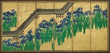 On view installation 2, September 8, 2012–January 13, 2013Ogata Kŏrin, the celebrated painter from Kyoto, depicted irises in many variations and media, and they became a standard theme among his followers. Here, their stately, vertical forms set against an angular bridge that sweeps diagonally across both screens reference an episode in The Ise Stories (Ise monogatari). Exiled from Kyoto after an affair with a high-ranking court lady, the story’s protagonist stops at Yatsuhashi, a place where a stream branches into eight channels, each with its own bridge. The sight of irises prompts him to compose a nostalgic love poem. The first syllable of each line of the poem forms the Japanese word for irises (kakitsubata), keeping in mind that ha and ba were written with the same character in ancient times. The English translation, though unable to convey the complex wordplay of the original, is also an acrostic:Karagoromo kitsutsu narenishi tsuma shi areba harubaru kinuru tabi o shi zo omou I wear robes with well-worn hems, Reminding me of my dear wifeI fondly think of always,So as my sojourn stretches onEver farther from home,Sadness fills my thoughts. —Trans. John T. Carpenter