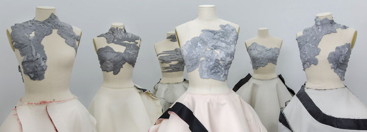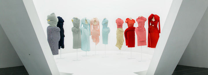Object/Subject considers hybrid bodies. Its focus is Kawakubo's collection Body Meets Dress—Dress Meets Body, which proposes a radical rethinking of the human form through down-padded garments of stretch nylon and polyurethane in a range of colors and patterns—including girlish bubblegum pink and powder blue gingham. Most of the paddings are arranged asymmetrically, creating bulbous swellings that present an illusion of dysmorphia and subvert the traditional language of the fashionable body (small waist, slim hips, pert bottom, flat stomach, and small, high breasts).