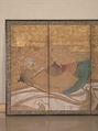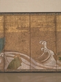 On view installation 1, May 26, 2012–September 3, 2013Wave-based imagery and designs, popular among painters of the Rinpa school, are here combined with another favorite image, the folding fan (ôgi), which had a variety of functions in ancient Japan. Its primary use was, of course, to cool its owner in the heat of summer; unfolded, it could also serve as a tray. One type of fan had iron ribs that could be used by warriors as impromptu weapons; others were employed in games or served as props in the performing arts. An important duty of painters in the service of the emperor or shogun was to paint and present fans to the court at the beginning of each year. While used fans were, in general, discarded at the end of summer, they were sometimes kept for their sentimental value and pasted into albums or onto folding screens. A screen ornamented with fans acted as a sort of miniature museum where many works of art could be viewed at once. The fans often appeared against a background of flowing water, a type of imagery that may have evolved from the medieval custom of casting fans into the water to float upon the surface. Screens painted with the fans-and-stream motif, known as “fans afloat” (senmen nagashi), were often installed in shogunal residences and may have derived from a tale about a Muromachi-period shogun who accidentally dropped a fan from a bridge.