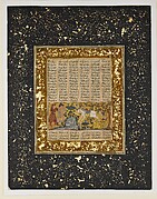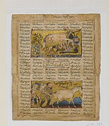 The Shahnama, the national epic of Persia, recounts the great deeds of Iranian kings from the creation of the world to the Arab conquest of the region in 642. In this image, which is contemporary with a number of the European unicorn images seen here, Iskandar (Alexander the Great) bravely battles a one-horned animal in the land of Habash (Ethiopia). In Persian legend, as in European, one-horned beasts were understood to be found in faraway lands. With its long horn, horselike body, and bearded chin, the Habash monster resembles a unicorn as imagined by Europeans. With hunters attacking from two sides, this scene brings to mind The Cloisters tapestry in which the unicorn defends itself.