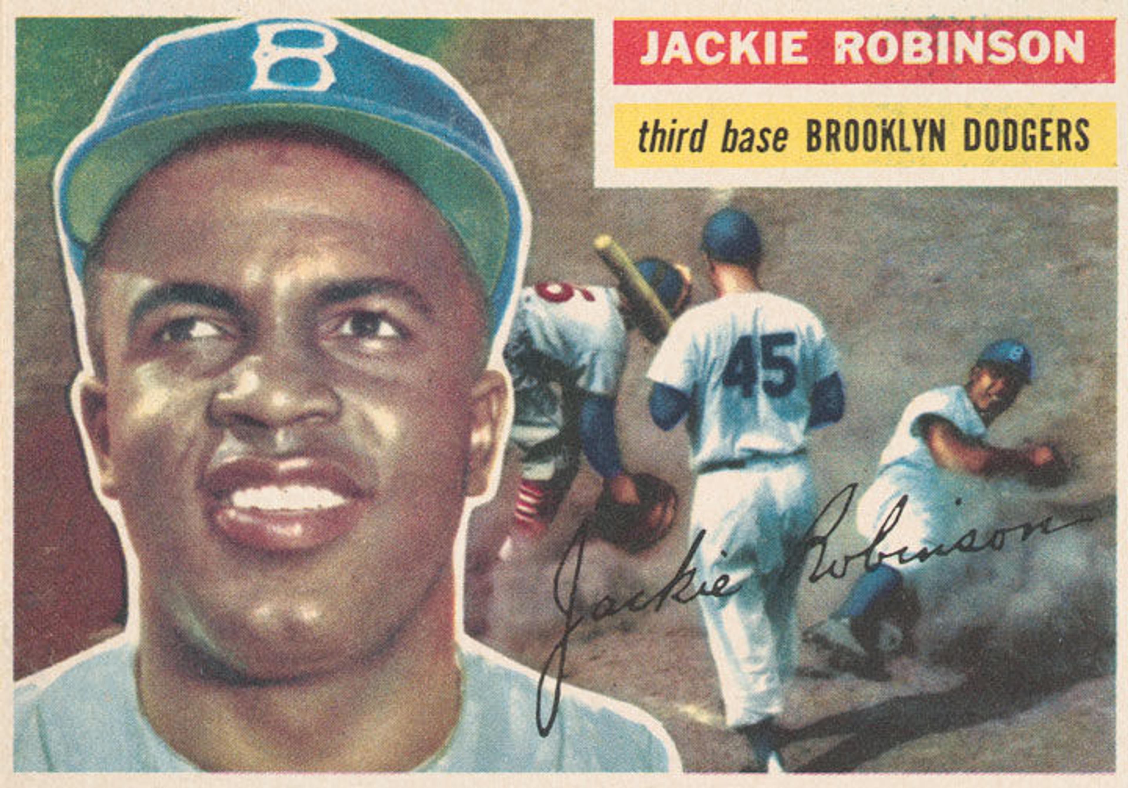 Issued by Topps Chewing Gum Company (American, Brooklyn). Jackie Robinson, Third Base, Brooklyn Dodgers, from the 1956 Topps Regular Issue series (R414-11), 1956. Commercial color lithograph, Sheet: 2 5/8 x 3 3/4 in. (6.7 x 9.5 cm). The Metropolitan Museum of Art, New York, The Jefferson R. Burdick Collection, Gift of Jefferson R. Burdick (Burdick 329, R414-11.1)