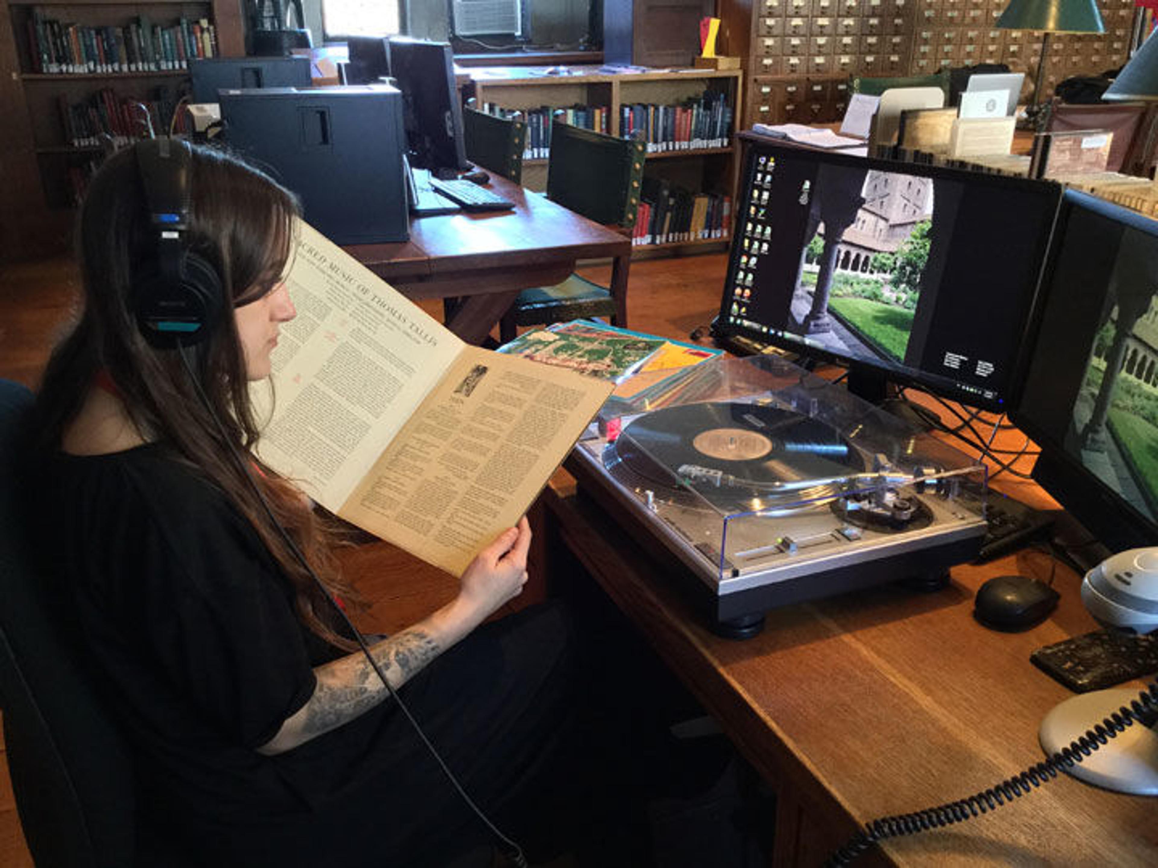 Co-author Sydney Gobin at the new hi-fi listening station in The Cloisters Library. Photo by Michael Carter