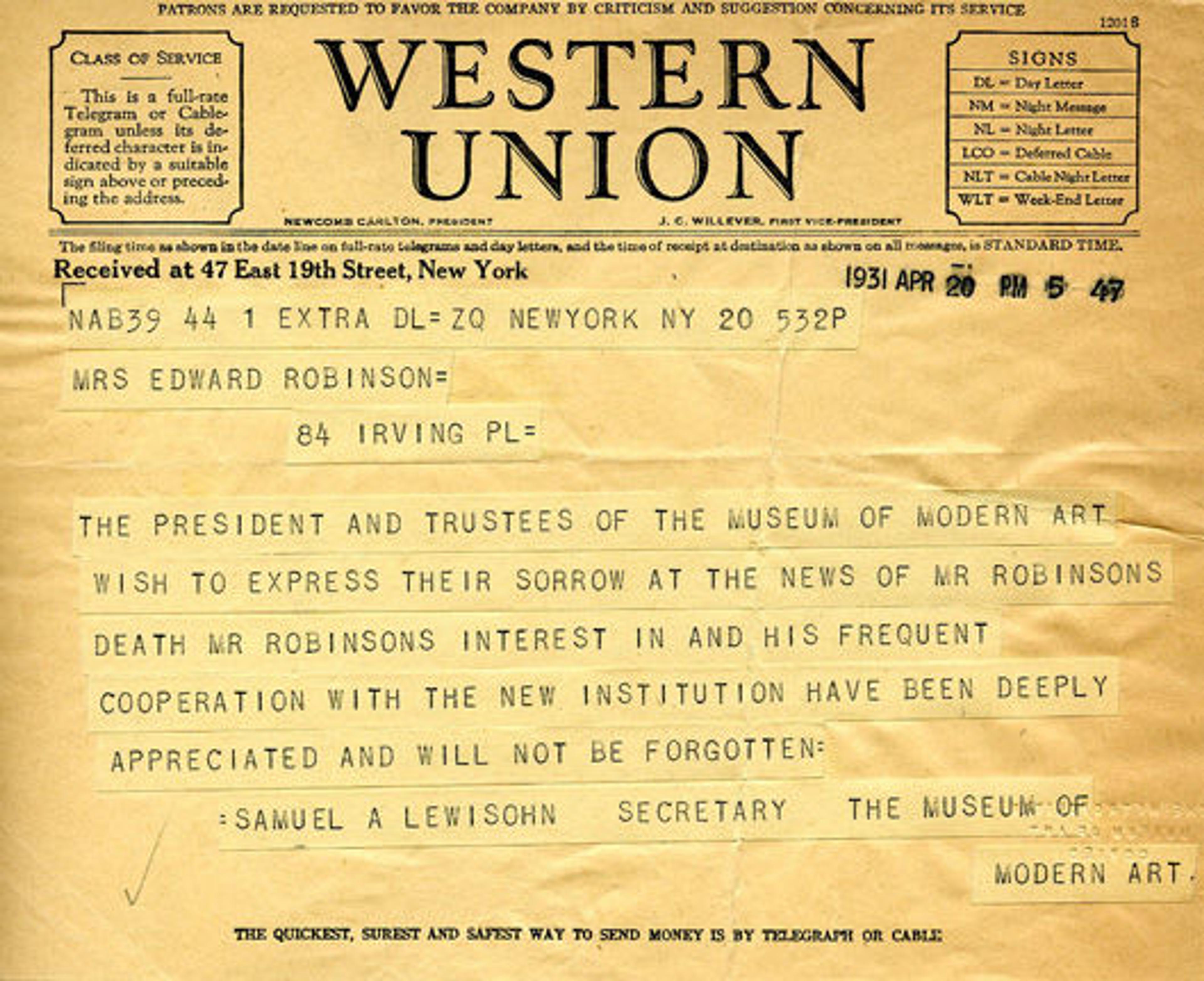 Telegram from the Museum of Modern Art to Mrs. Edward Robinson conveying condolences, April 20, 1931. Office of the Secretary Records, The Metropolitan Museum of Art Archives
