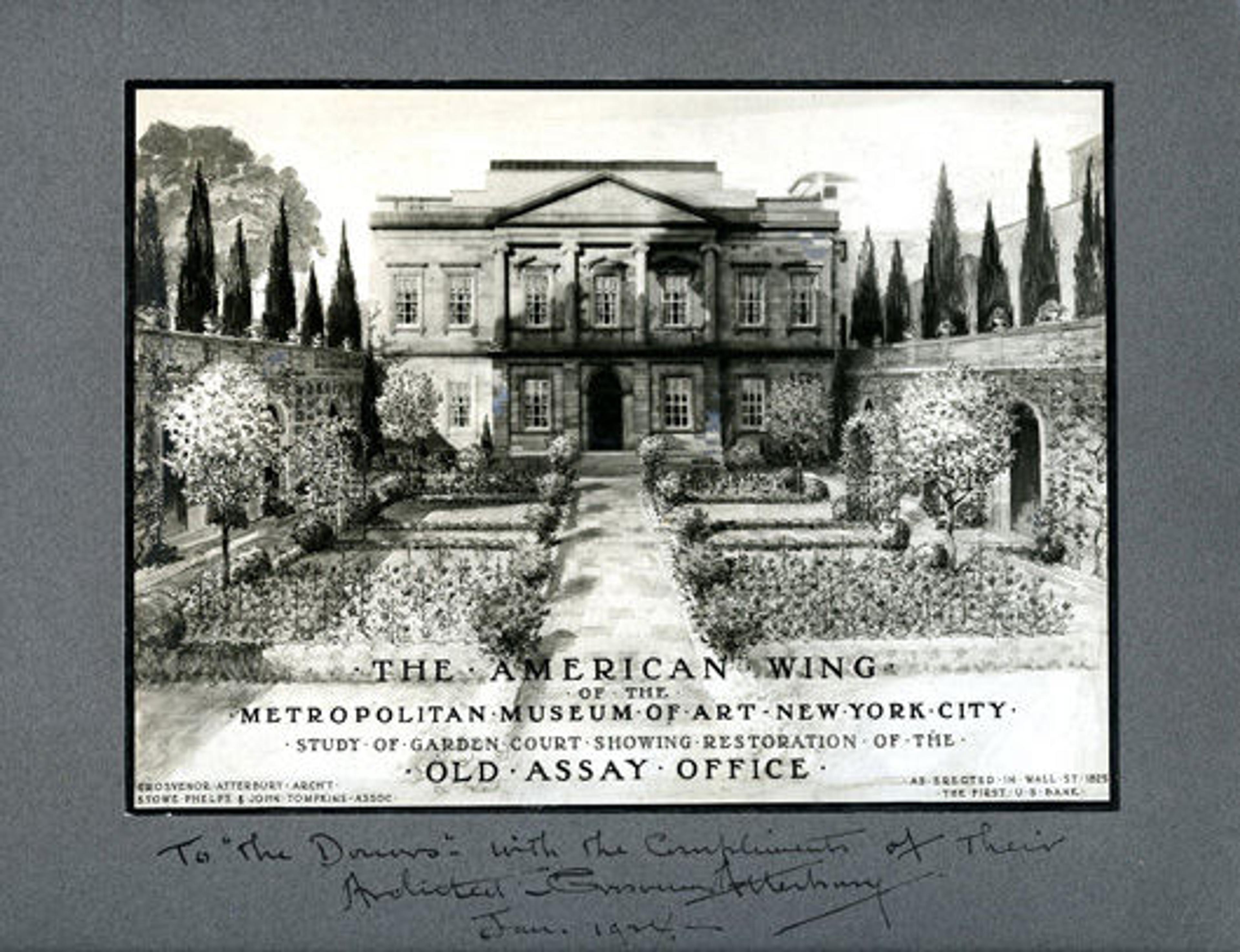 Photograph of rendering of Old Assay Office facade with proposed garden for the new American Wing. Signed by G. Atterbury to the De Forests, January 1924. Office of the Secretary Records, The Metropolitan Museum of Art Archives