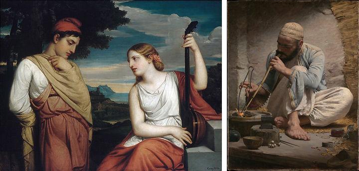 Left: Henry Peters Gray (American 1819–1877). The Greek Lovers, 1846. Oil on canvas, 40 1/4 x 51 1/2 in. (102.2 x 130.8 cm). The Metropolitan Museum of Art, New York, Gift of William Church Osborn, 1902 (02.7.2). Right: Charles Sprague Pearce (1851–1914). The Arab Jeweler, ca. 1882. Oil on canvas, 46 x 35 3/8 in. (116.8 x 89.9 cm). The Metropolitan Museum of Art, New York, Gift of Edward D. Adams, 1922 (22.69)