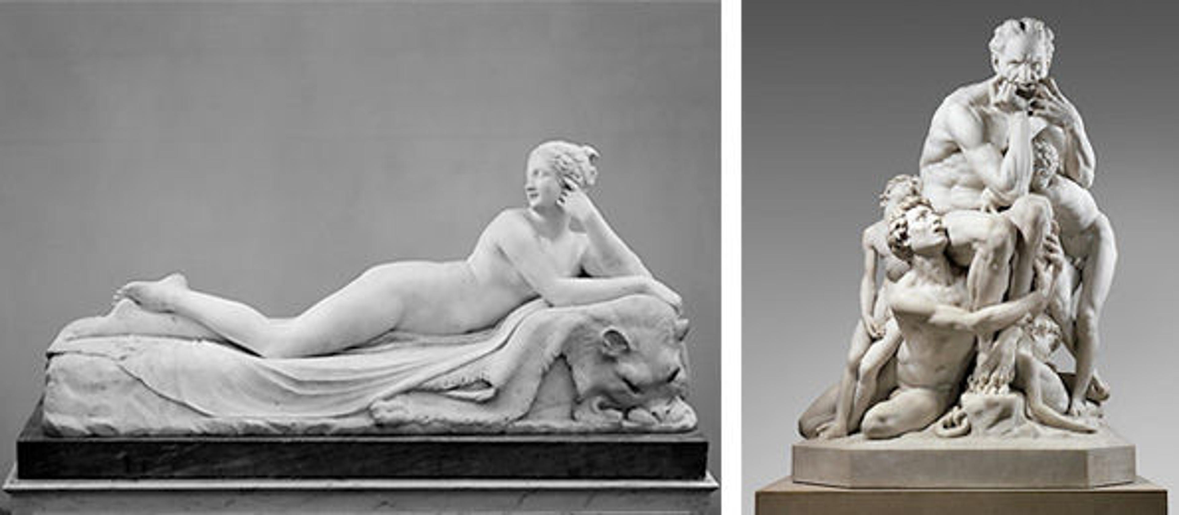Left: Antonio Canova (Italian, 1757–1822). Reclining Naiad, 1819–24. Marble; Overall (wt. confirmed): 35 x 75 x 32 1/2 in.; 2558 lbs. (88.9 x 190 x 82.6 cm; 1160.3012 kg). The Metropolitan Museum of Art, New York, Purchase, Mrs. Joseph A. Neff Gift, In memory of Joseph A. Neff, 1970 (1970.1). Right: Jean-Baptiste Carpeaux (French, 1827–1875). Ugolino and His Sons, 1865–67. Saint-Béat marble; Overall (confirmed): 77 3/4 x 59 x 43 1/2 in. (197.5 x 149.9 x 110.5 cm). The Metropolitan Museum of Art, New York, Purchase, Josephine Bay Paul and C. Michael Paul Foundation Inc. Gift, Charles Ulrick and Josephine Bay Foundation Inc. Gift, and Fletcher Fund, 1967 (67.250)
