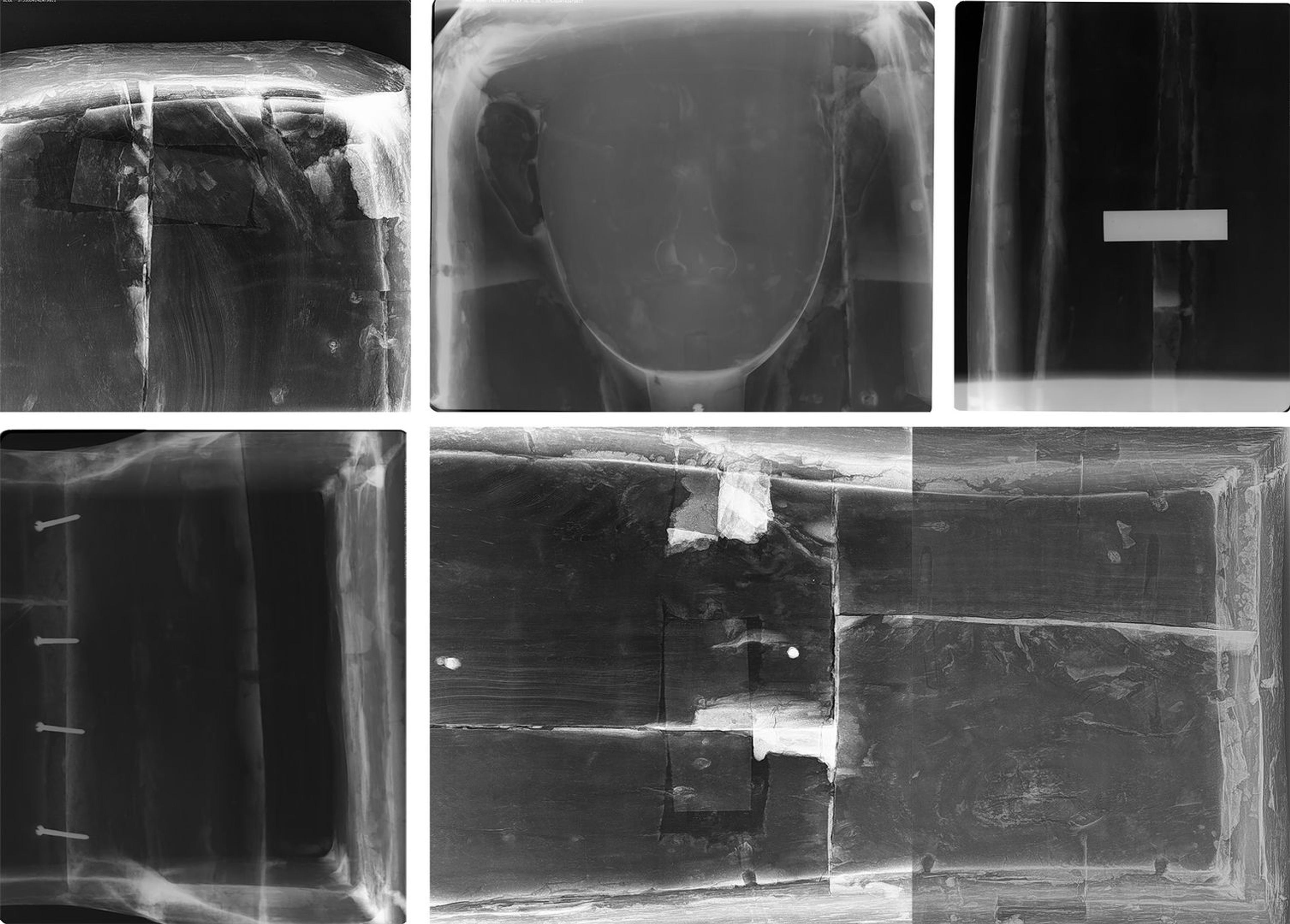 Figure 6. Computed X-ray radiographs showing sawn-through tenon (upper left), separately carved and attached face (upper center), modern hardware (upper right and lower left), and various tenons and dowel holes within the boards of the box (lower right)