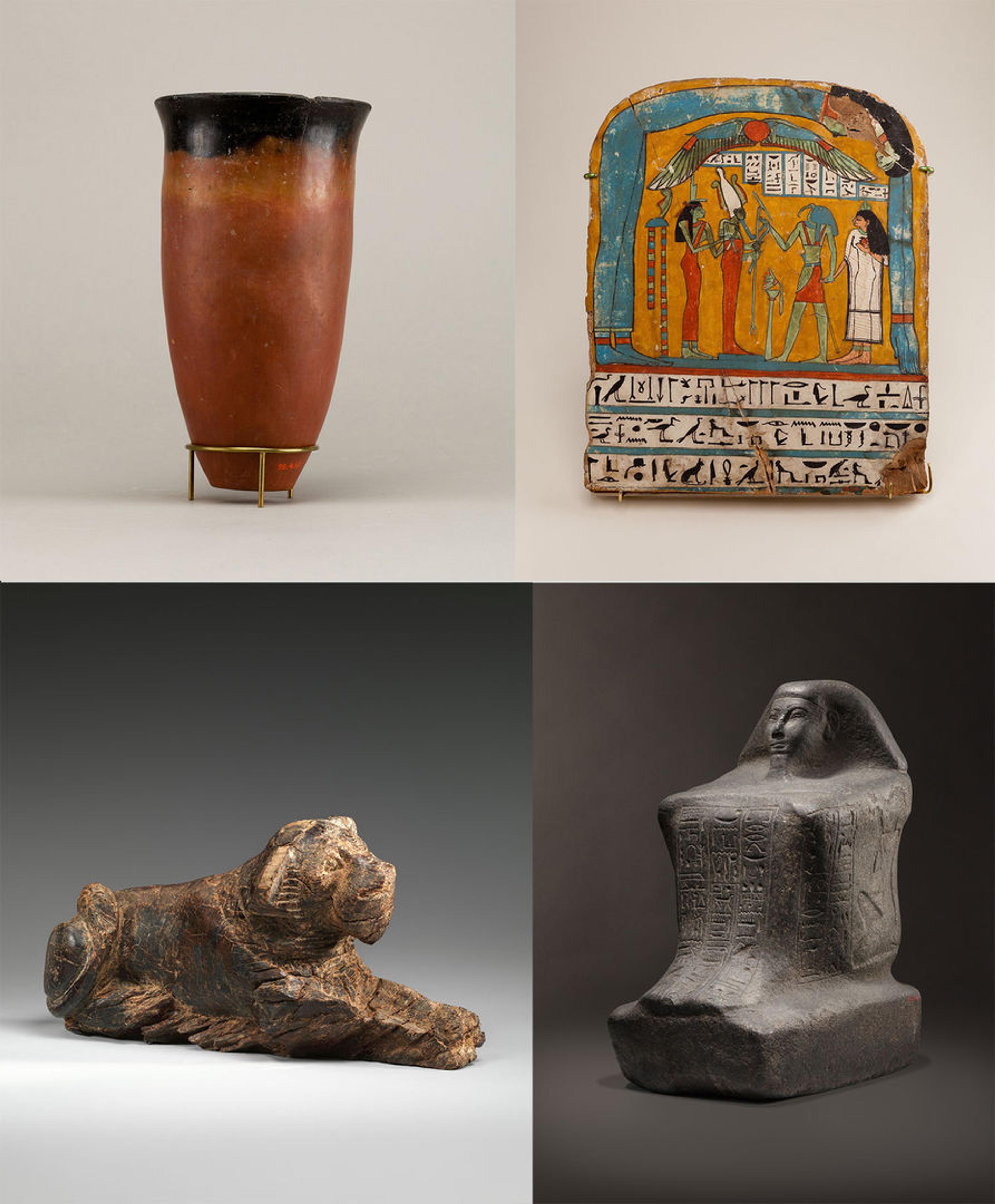 Clockwise from upper left: Black-topped Red Ware Beaker, ca. 3850–2960 B.C. Pottery. The Metropolitan Museum of Art, New York. Gift of Egypt Exploration Fund, 1899 (99.4.111); Stela of Tabakenkhonsu, ca. 680–670 B.C. Wood, paste, paint. The Metropolitan Museum of Art, New York. Gift of Egypt Exploration Fund, 1896 (96.4.4); Block Statue of Nedjem, ca. 1184–1153 B.C. Diorite. The Metropolitan Museum of Art, New York. Gift of Egypt Exploration Fund, 1906 (06.1231.88); Game Piece in the Form of a Lion, ca. 3100–2649 B.C. Ivory. The Metropolitan Museum of Art, New York. Gift of Egypt Exploration Fund, 1903 (03.4.13)