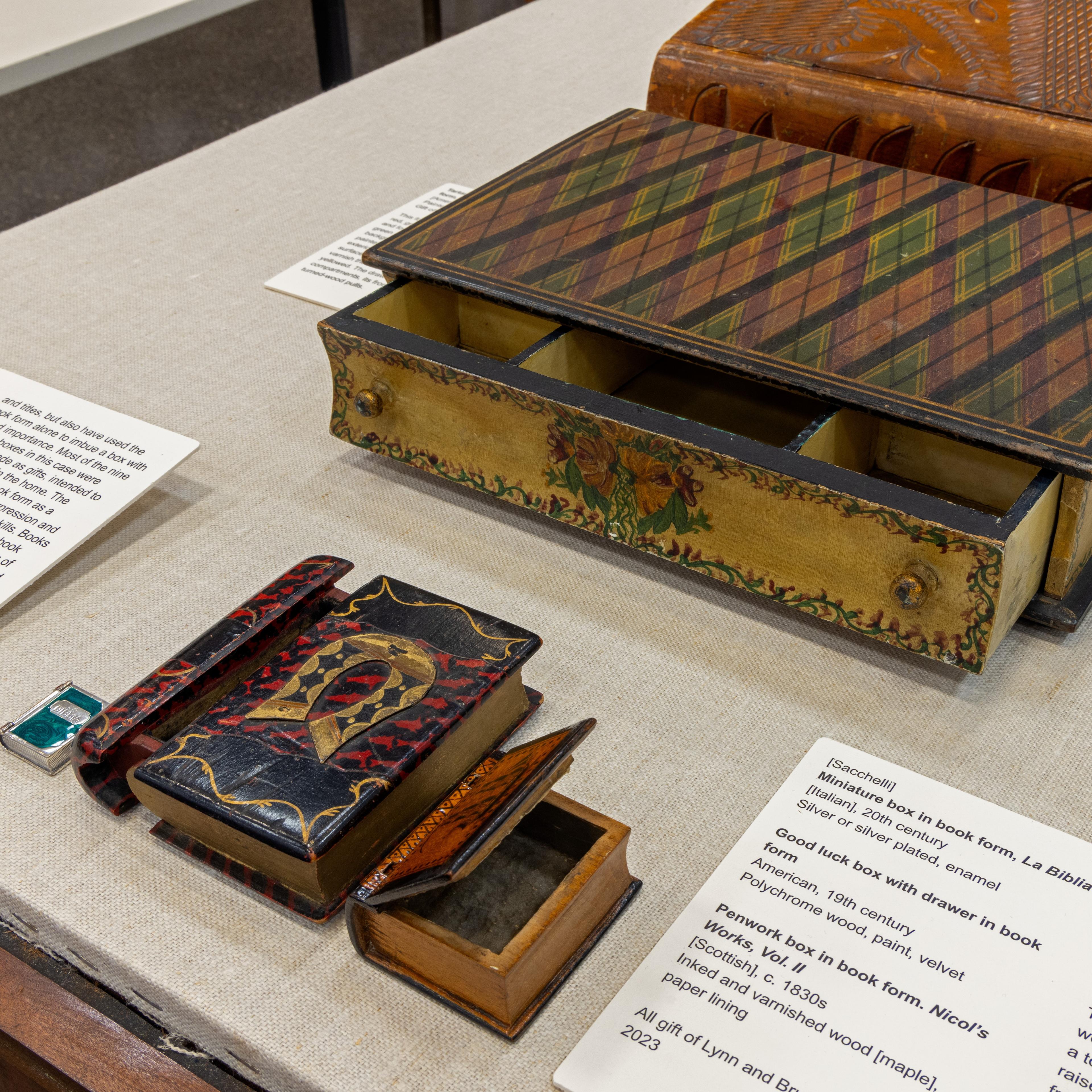 The book is an ideal form for making boxes, as only a few added features will make the box more interesting. This device has been widely used by custom and commercial box-makers, and it has been proven to add novelty and meaning to boxes. Wooden book boxes have been made in a tremendous variety in imitation of specific book subjects and titles, but also have used the book form alone to imbue a box with added importance. Most of the nine wooden boxes in this case were probably made as gifts, intended to create beauty in the home. The artists used the book form as a canvas for creative expression and as a showcase for their skills. Books typically used as models for book boxes include multi-volume sets of known or fictional works, bibles and prayer books, photograph albums and friendship books, account books, literary and historical works, children’s books, and fine bindings.
