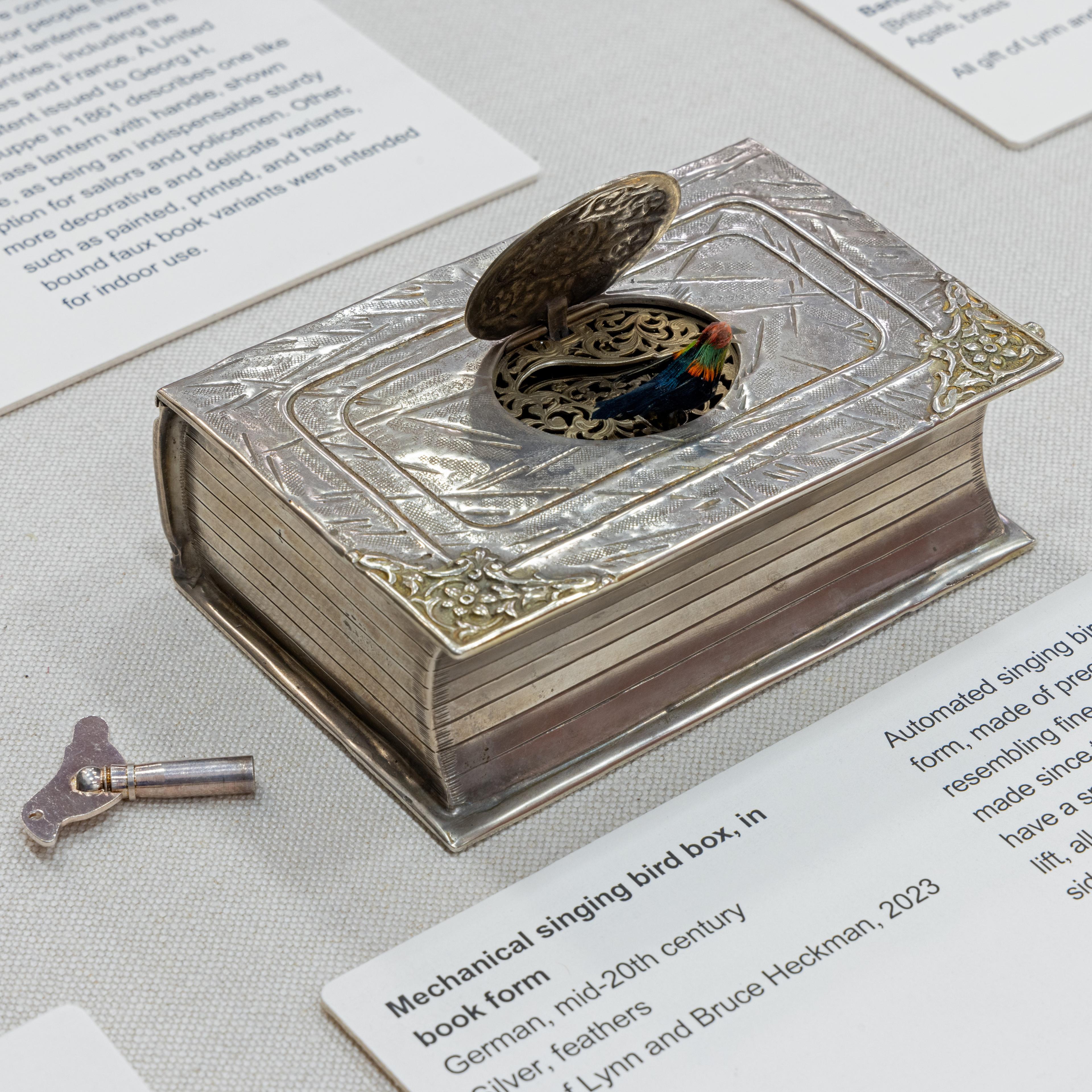 The custom of making stone books in many countries — as tokens of friendship and love, commemorative objects, bibles, and souvenirs — has been an international craft tradition practiced by professional and amateur carvers since the mid-19th century. Most stone books are of a deeply personal nature, and all seem to highlight the book form as an object of importance. Their sizes range from hand-held to monumental, and their designs range from the simplest of book forms to those resembling elaborate fine bookbindings. Many types of stones were used, and some stone books were painted to appear as other more expensive stones or as real books. The five stone books in this case include Petosky stone (regional to Lake Michigan), Catlinite (native to Minnesota and Ontario), white marble, and banded agate. The three metallic objects shown are two aesthetically different portable candle lanterns and an amusing automated musical singing bird which resides in a silver book.