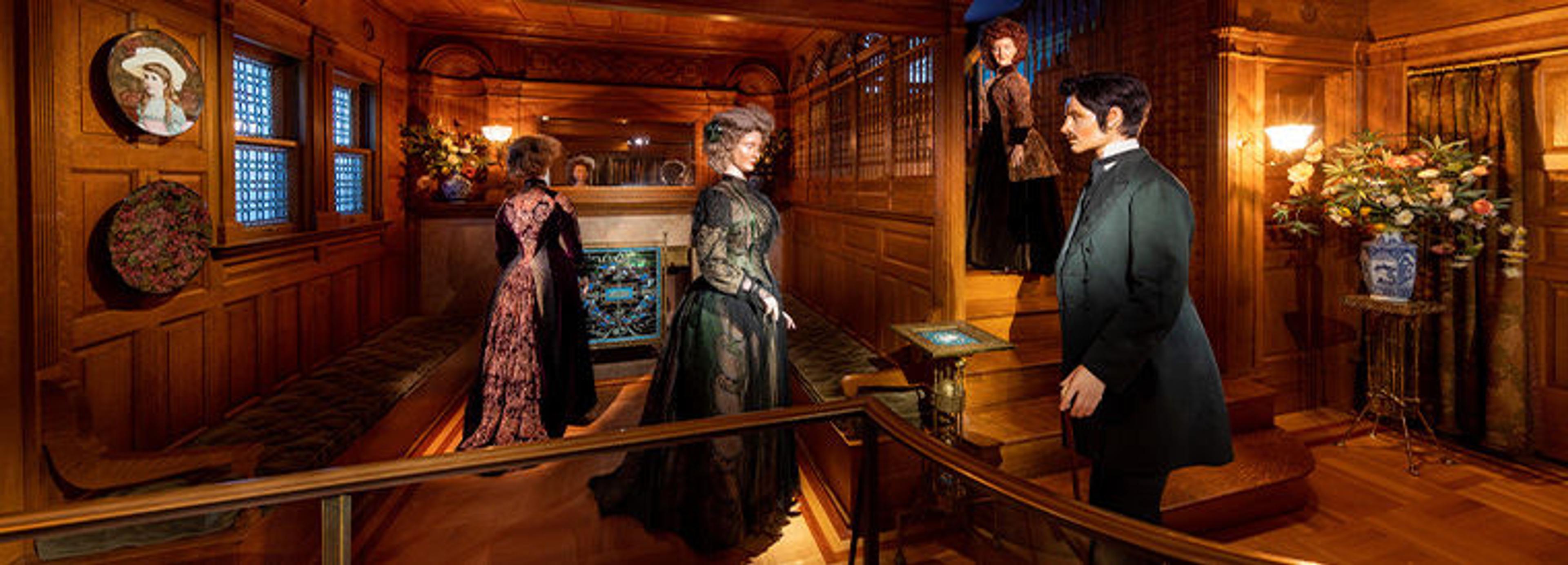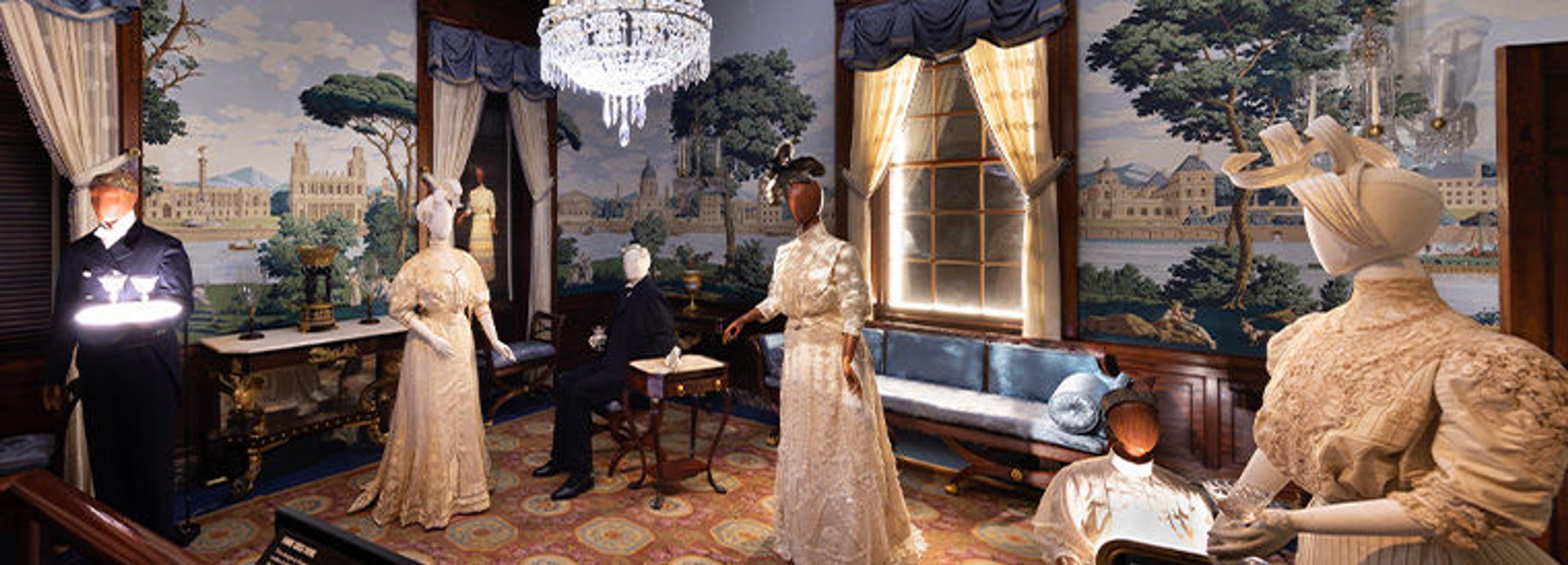 The Stair Hall, designed in 1882 by the leading architectural firm McKim, Mead & White, highlights superb examples of New York dressmaking and tailoring from the same era. Two striking dresses by Franziska Noll Gross showcase her inventive use of rich textiles and trimmings, which are arranged to accentuate the strong silhouette of the 1880s. Gross, who emigrated from Germany, maintained her New York dressmaking business from the 1860s into the 1890s. The neatly tailored coat and waistcoat by Mathias Rock illustrate the subdued palette and streamlined silhouette of menswear during this period. Rock trained in his native Germany as well as in London and Paris before establishing himself in New York, eventually earning praise as “the tailor par excellence of America.”