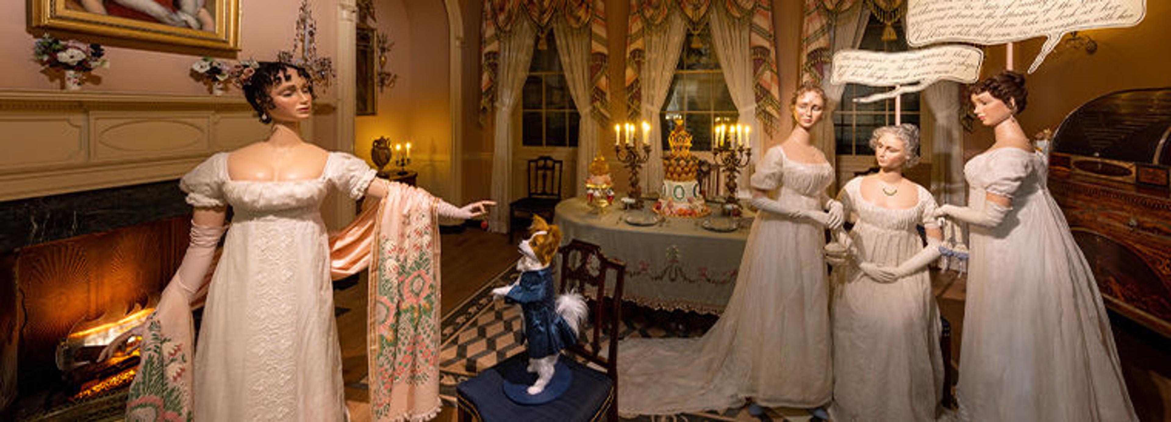 In France, a revived interest in classical antiquity resulted in the popularization of dresses with narrow silhouettes and high waistlines. Characteristic of this French Neoclassical style, the evening gown highlighted at the center of the room was worn by Elizabeth Patterson Bonaparte (1785–1879), daughter of a prosperous Baltimore merchant and briefly the wife of Jérôme Bonaparte, younger brother of Napoleon.