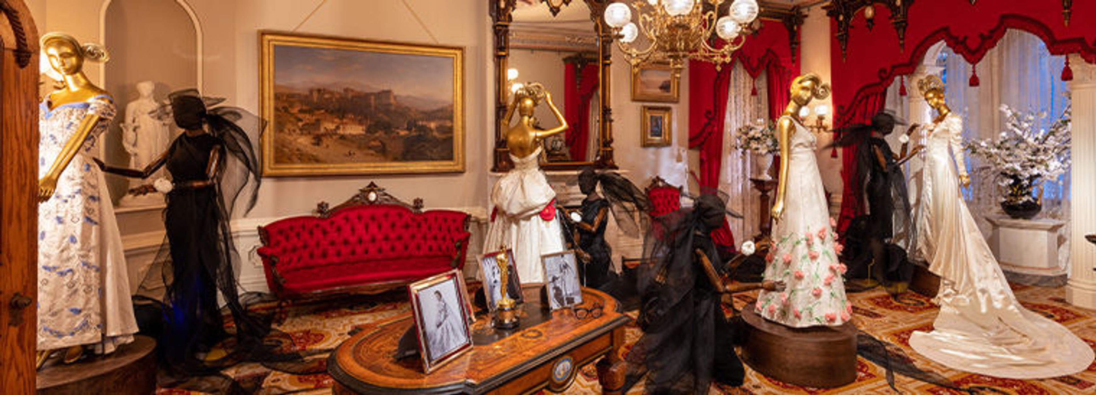Mid-twentieth-century American fashion was shaped by both the modernist impulse toward streamlined simplicity and the historicist tendency toward greater elaboration. The latter mode is represented here by Ann Lowe, whose designs— similar to the Renaissance Revival parlor—display the influence of historical sources, seen in their strong silhouettes and rich ornamentation. The expansive bow adorning the ivory ball gown, for instance, evokes the airy draping of an 1870s bustle, while the three-dimensional lilies on the wedding dress recall nineteenth-century bridal traditions, with Lowe’s signature fabric flowers as sculptural focal points rather than fussy decoration.