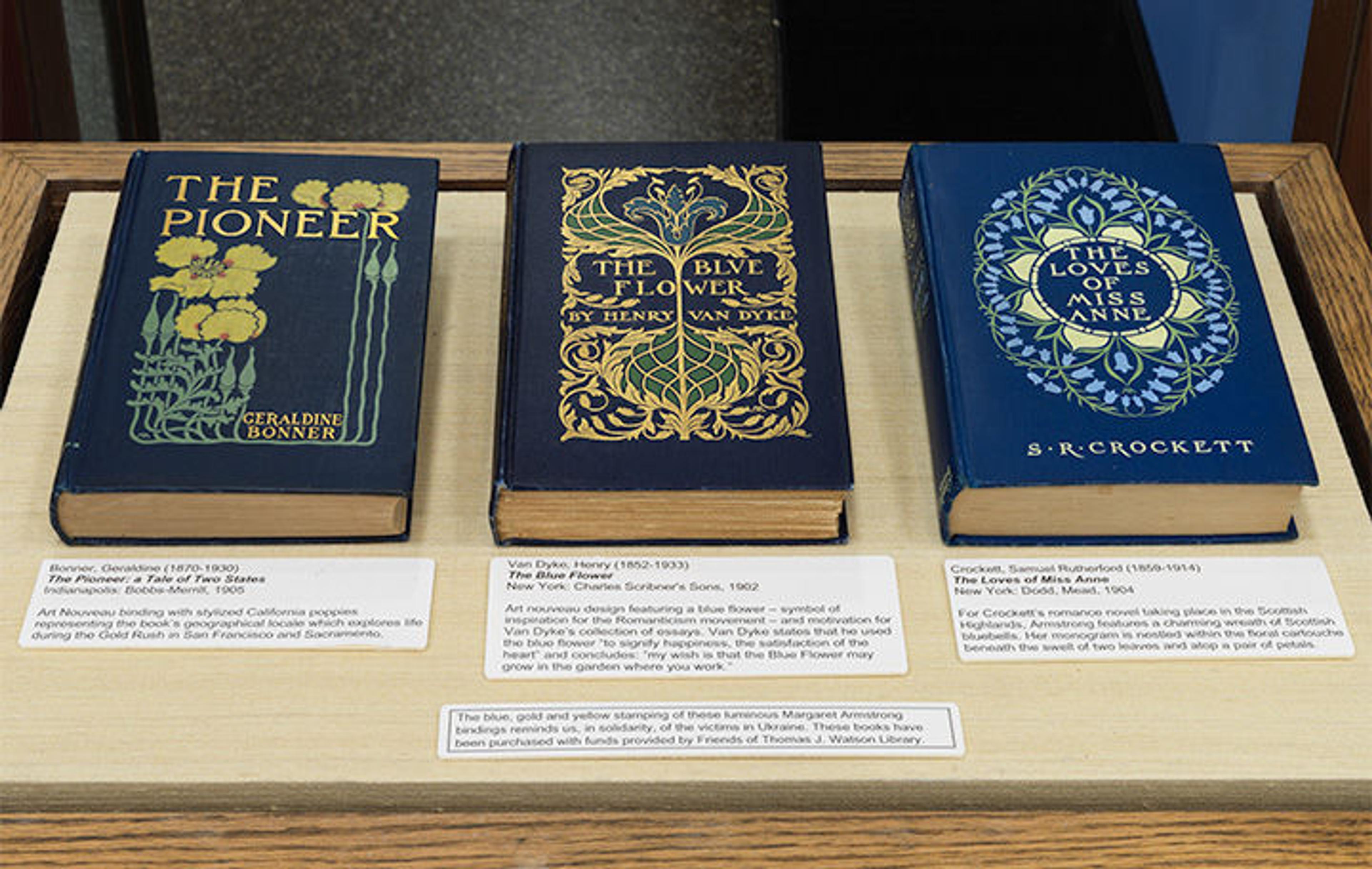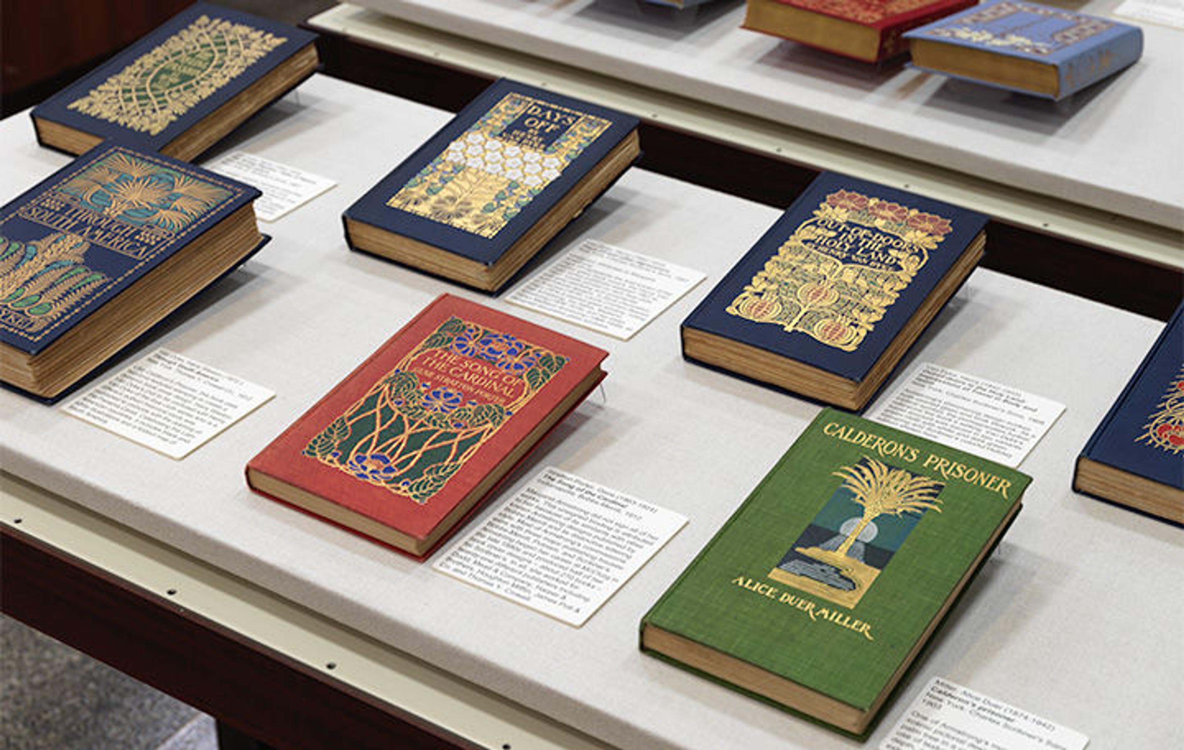 Margaret Armstrong’s love of nature was often reflected in her book cover designs using copious flower, vine, and plant themes as shown in this selection of bindings. In addition to her work as a book cover designer, Armstrong was also an author, field collector, and botanical illustrator. After traveling throughout the Western United States and Canada five times between 1909 and 1914, she wrote and illustrated Field Book of Western Wild Flowers (1915), the first comprehensive guide on the subject.