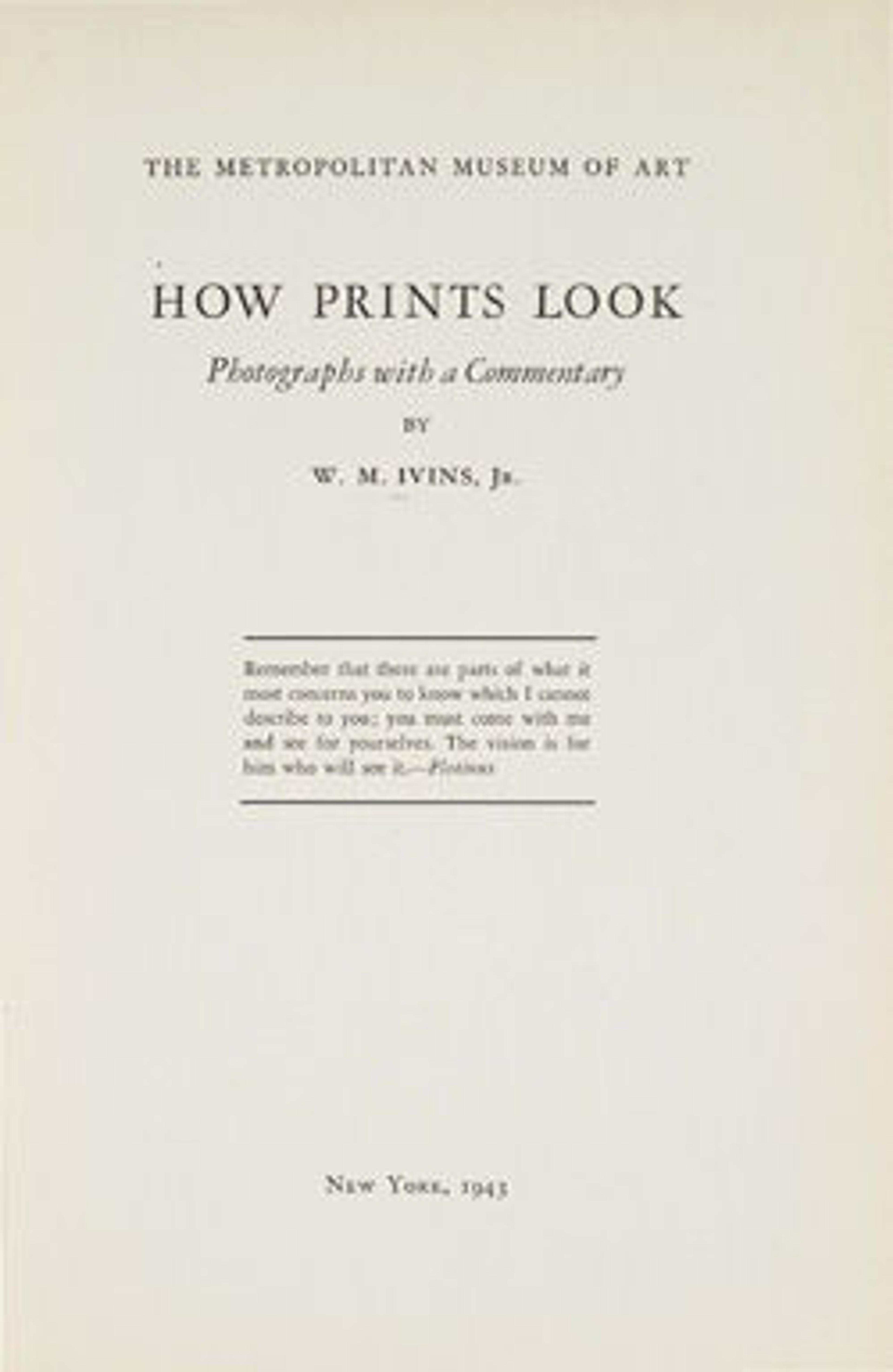 This book is an elementary introduction to the appearances of prints. Several details of prints in the Met's collection are reproduced here with accompanying text that guides the reader to understand the techniques and materials used. Ivins's captions highlight certain aspects of the prints that provide greater insight into the artists' practice and the pieces themselves. This book is a starting point for further study and appreciation of the vast world of prints.