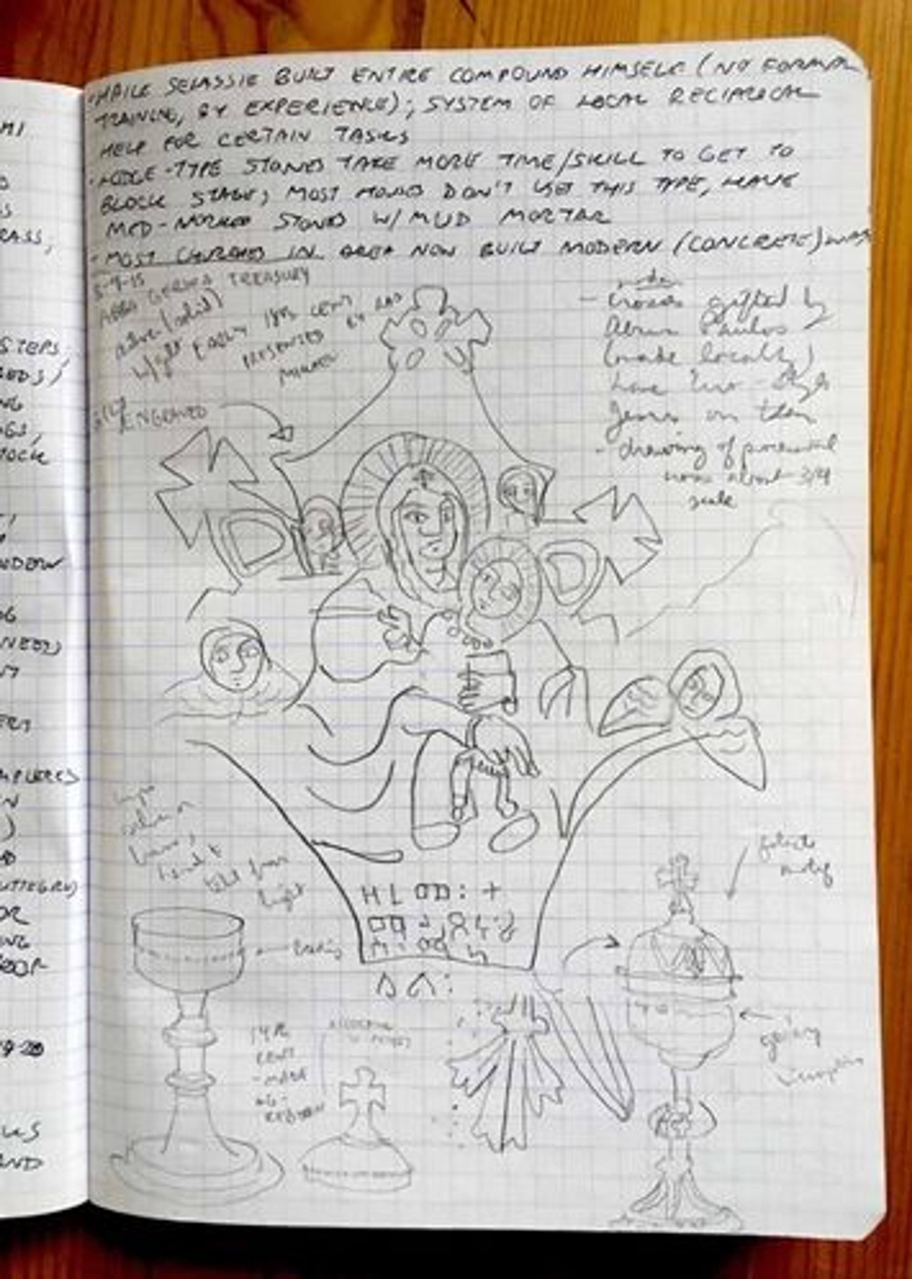 Right: The author's field notebook from the summer of 2015, opened to sketches drawn at Enda Abba Garima, an Ethiopian monastery