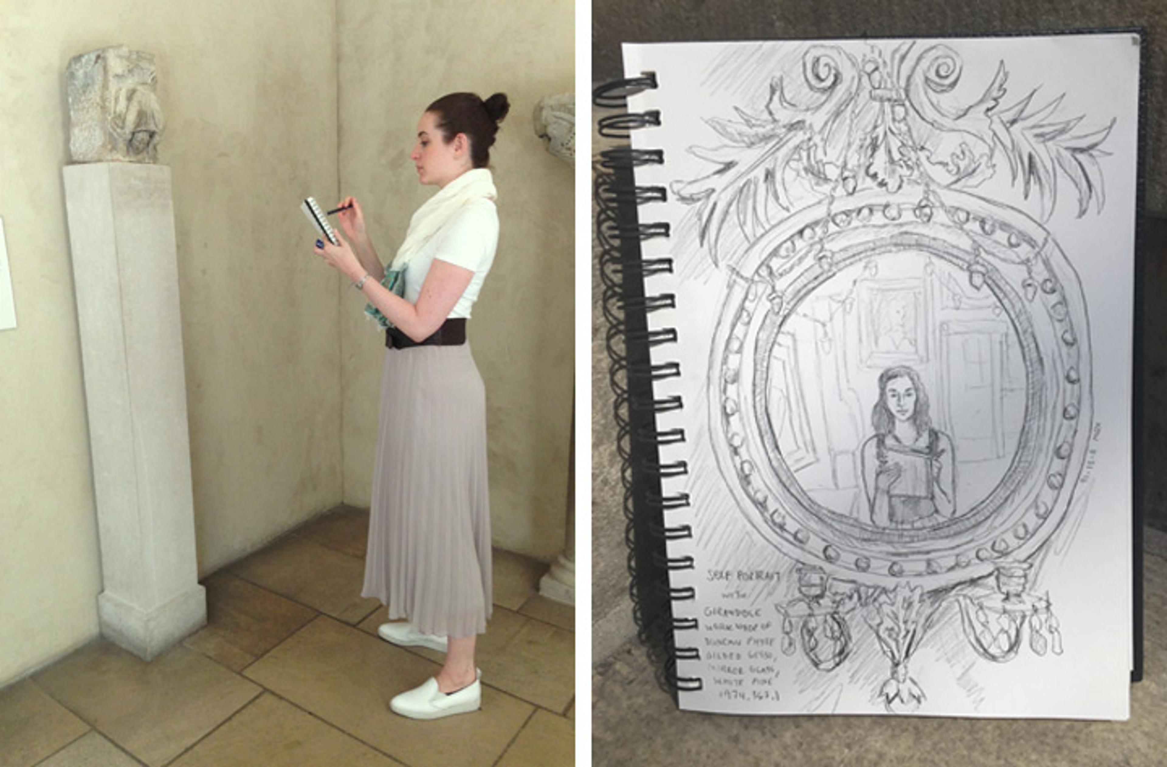 Left: Day 326. Sketching at The Met Cloisters. Photo by Kate Holohan. Right: Day 366. Self-portrait with girandole